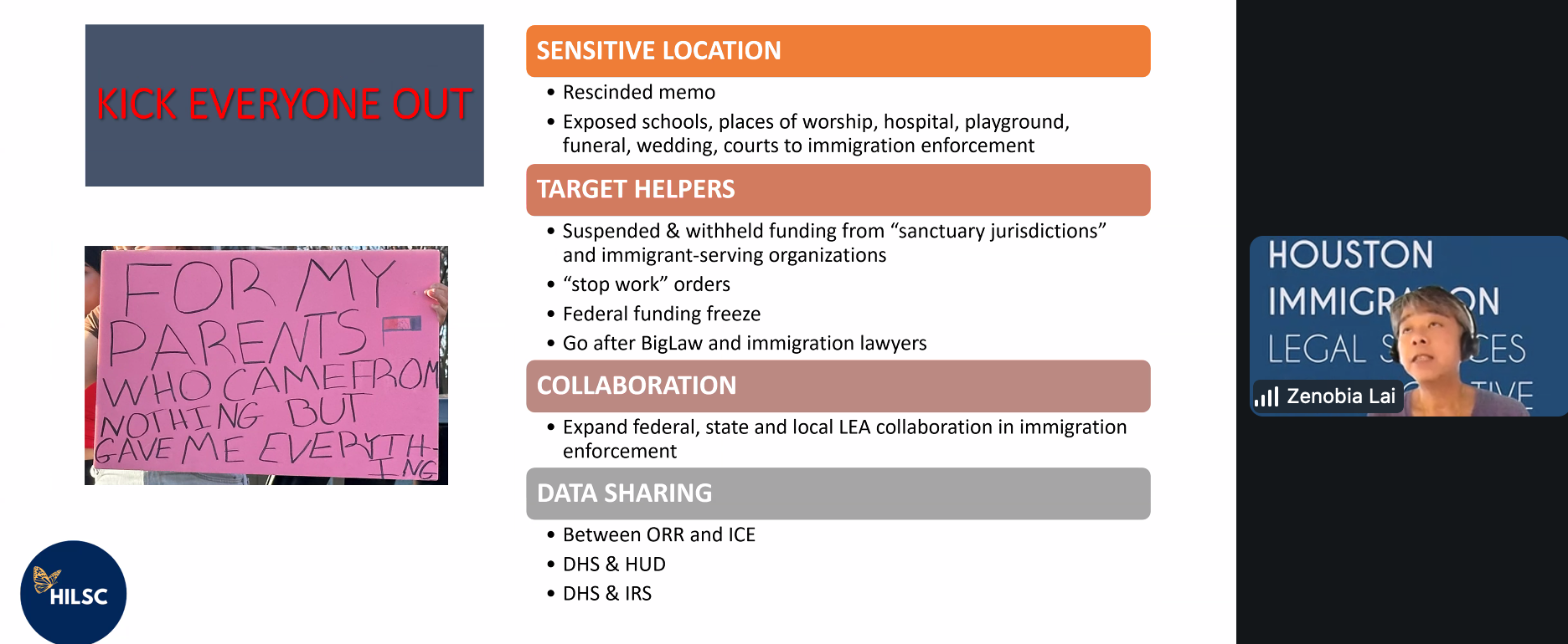 休斯顿移民法律服务合作组织 (Houston Immigration Legal Services Collaborative) 执行董事 Zenobia Lai 在简报会上说, " 本届政府不仅在第一天就发布了至少 7 项与移民相关的行政命令(总计 26 项) - 通过授权军队、联邦、州和地方执法部门打击边境,宣布大规模移民进入国家紧急状态,他们还在使用过时的战争手段来挑选人, 特朗普于3月中旬援引 1798年的《敌对外国法案》。这是二战以来首次将数百名移民遣返到萨尔瓦多和巴拿马等其他国家。虽然特朗普的目标是委内瑞拉的 Tren de Arangua 帮派, 但目前尚未提供任何证据表明哪些人被遣返,以及他们是帮派成员还是罪犯。美国政府表示已将另外17名来自 Tren de Aragua 帮派和 MS-13 帮派的 ''暴力罪犯'' 遣返至萨尔瓦多的最高安全监狱,其中包括杀人犯和强奸犯。这是美国国务卿 Marco Rubio 与萨尔瓦多总统 Nayib Bukele 于2月初达成的一项协议的延续,该协议旨在监禁被驱逐的美国罪犯,无论国籍如何。Rubio 后来将其描述为 ''世界上前所未有、最非凡的移民协议'' 。其他策略包括:上任第一天就颁布行政命令,取消出生公民权(特朗普随后将此诉诸最高法院);撤销拜登时代的 ''敏感地点政策'',该政策保护教堂、学校、医院和葬礼等公共场所免受移民执法的侵害;以及通过行政命令要求各州与美国国税局等联邦机构共享数据,同时大规模裁员和削减预算,从而削弱了安全网。"