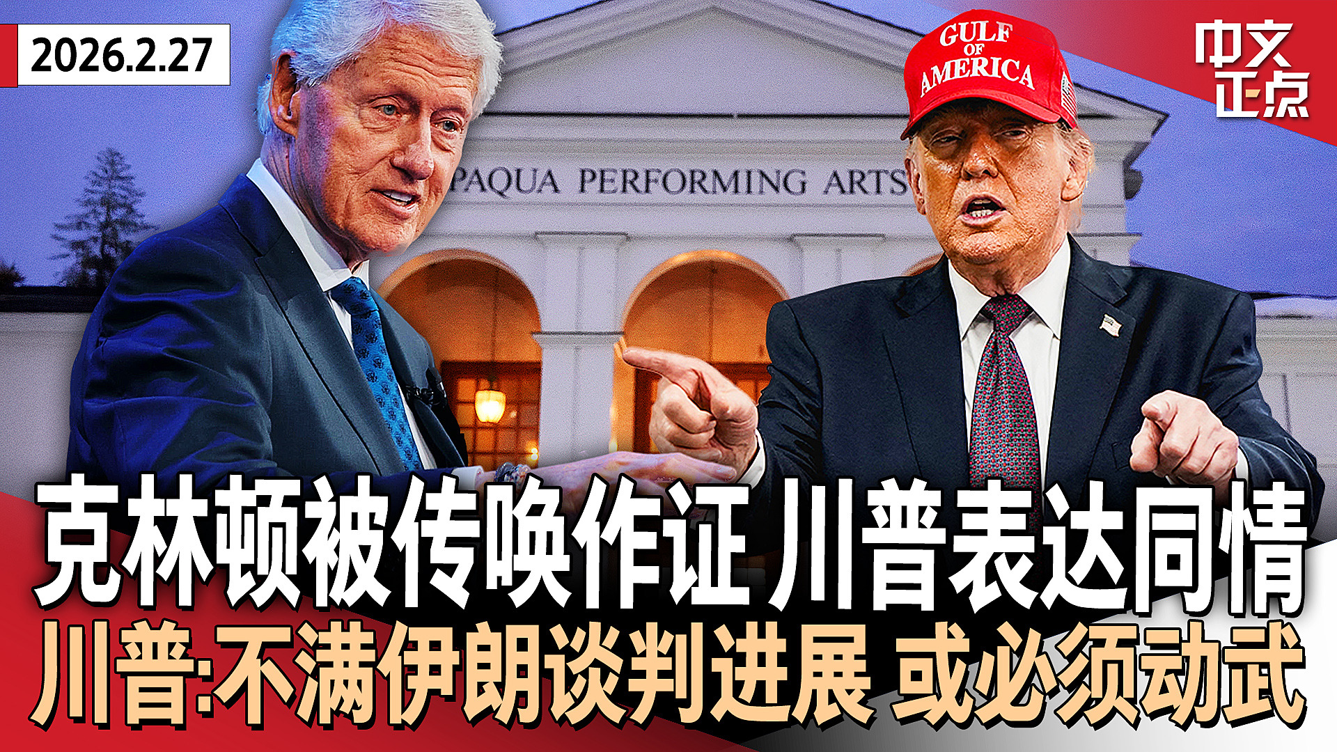 克林顿就爱泼斯坦案接受国会质询 川普表达同情|对伊朗战云密布!川普:不满谈判进展|索取完整选民登记数据 司法部再起诉5州|美国楼市迎“心理关口”!房贷利率3年来首次跌破6%《中文正点》26.2.27