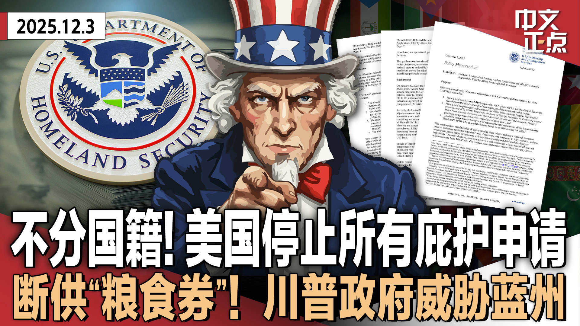 不分国籍!美国暂停所有庇护申请 冻结19国全部移民申请|断供“粮食券”川普政府威胁蓝州|要抓5000移民 联邦特工突袭新奥尔良|亚裔男子绿卡面试突被抓|爱泼斯坦“萝莉岛”曝光《中文正点》25.12.3