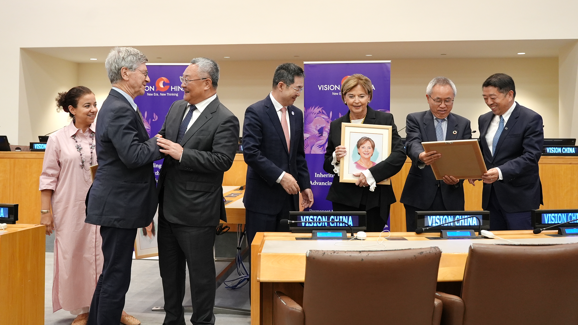 中国常驻联合国代表、特命全权大使傅聪(左三),中国日报社社长兼总编辑曲莹璞(左四),中国银行美国地区行长胡威(右一)向演讲嘉宾赠送纪念品