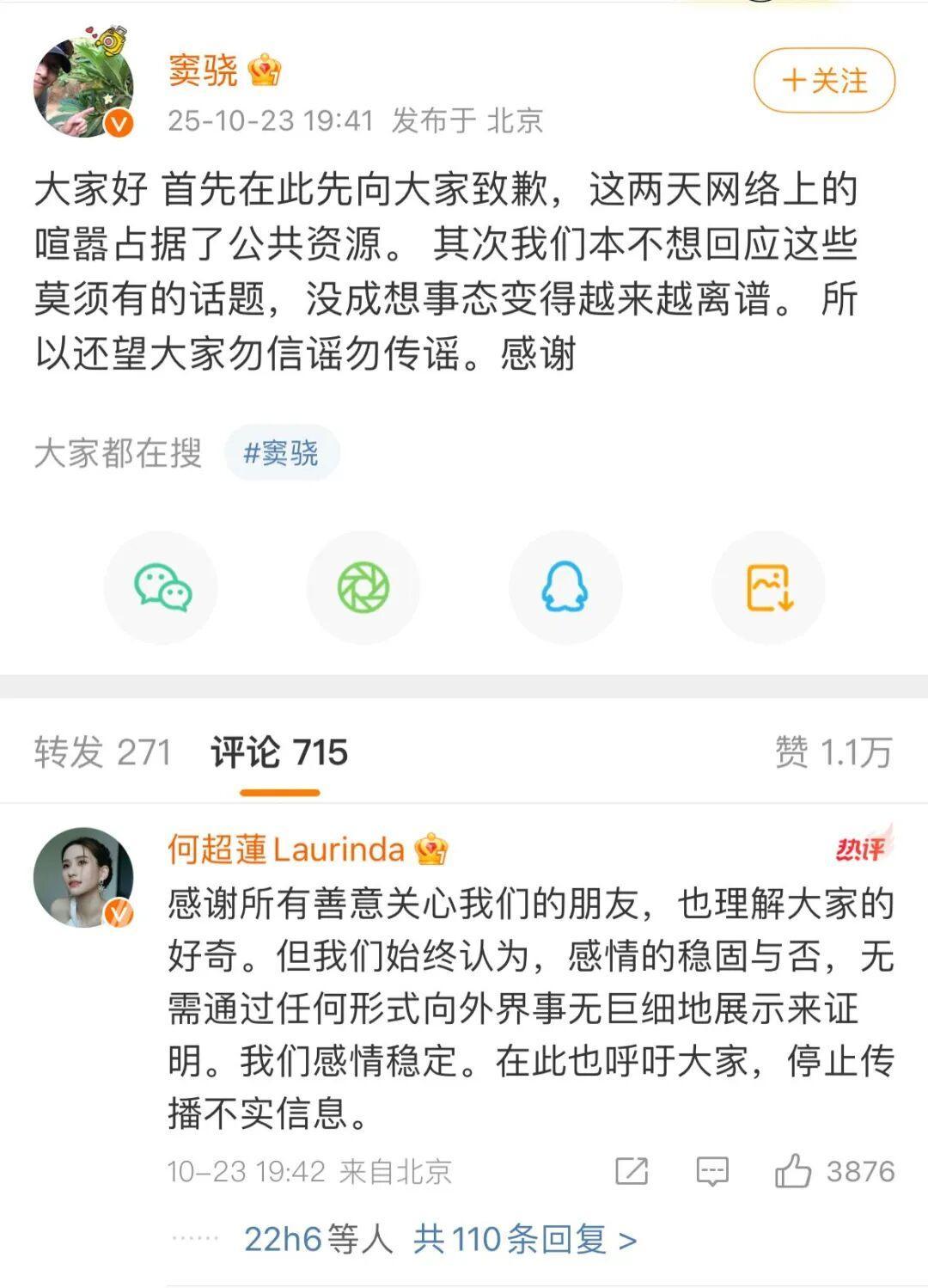 10月23日19:41,近日因向太发布的视频引发婚变传闻的窦骁、何超莲夫妇发布声明。