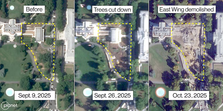 白宫此前在夏季发布的声明中表示,该项目计划于9月启动,并将在“川普总统任期结束前完工”。行星实验室最新拍摄的图像显示,东翼现已被完全拆除,宴会厅预定占地范围内的施工已明显推进。