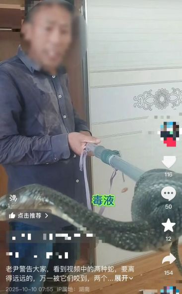 尹某一位朋友告诉中国新闻周刊,尹某今年59岁,平时独居,经常在短视频平台直播玩蛇,自称并非为了赚钱。尹某视频账号显示,就在其被蛇咬伤的16天前,曾发布科普视频说:“老尹警告大家,看到视频中的两种蛇,要离得远远的,万一被它们咬到,两个小时内必须要去大医院打血清”。