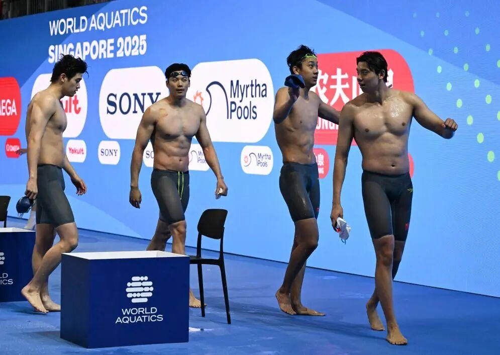 2025年8月1日,亚军由潘展乐、汪顺、张展硕、季新杰(从左至右)组成的中国队在比赛后。新华社记者夏一方摄