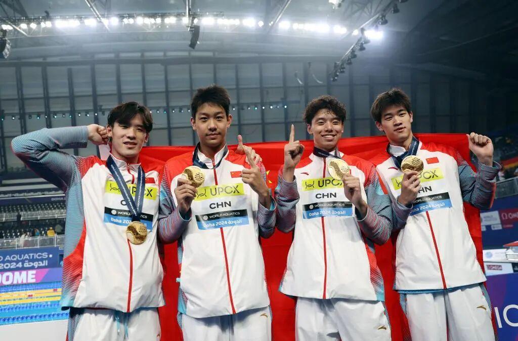 2024年2月11日,中国队选手王浩宇、张展硕、季新杰和潘展乐(从左到右)在颁奖仪式后合影庆祝。当日,在卡塔尔多哈进行的2024年世界游泳锦标赛游泳项目男子4X100米自由泳接力决赛中,中国队以3分11秒08的成绩夺冠。新华社记者雒圆摄