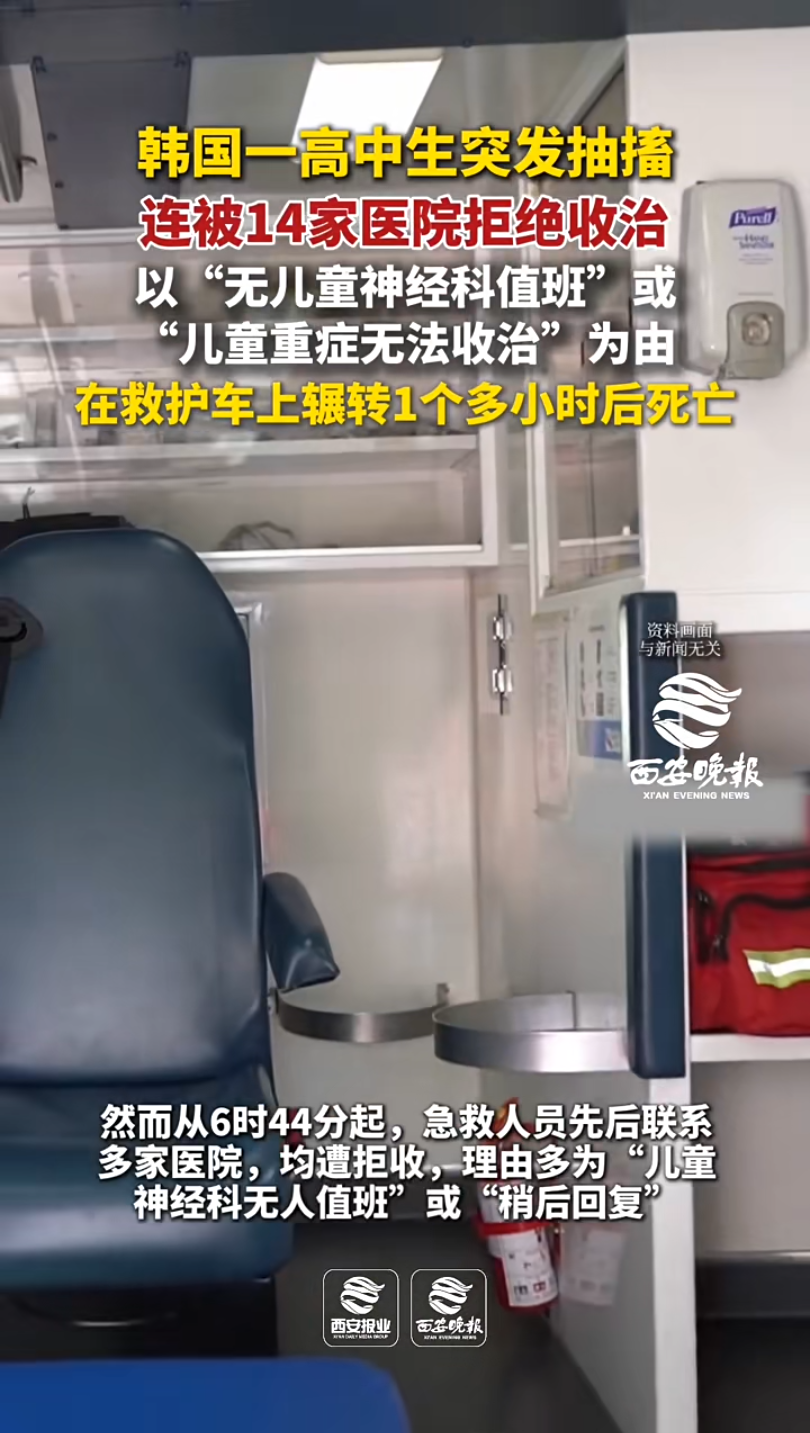 釜山一名高三男生上个月突发痉挛,急救队联系14家医院均遭拒绝,最终在第15家医院确认可接收时其已陷入心脏骤停,后经抢救无效身亡。韩国舆论纷纷质疑当地急诊医疗体系为何在关键时刻失灵。
