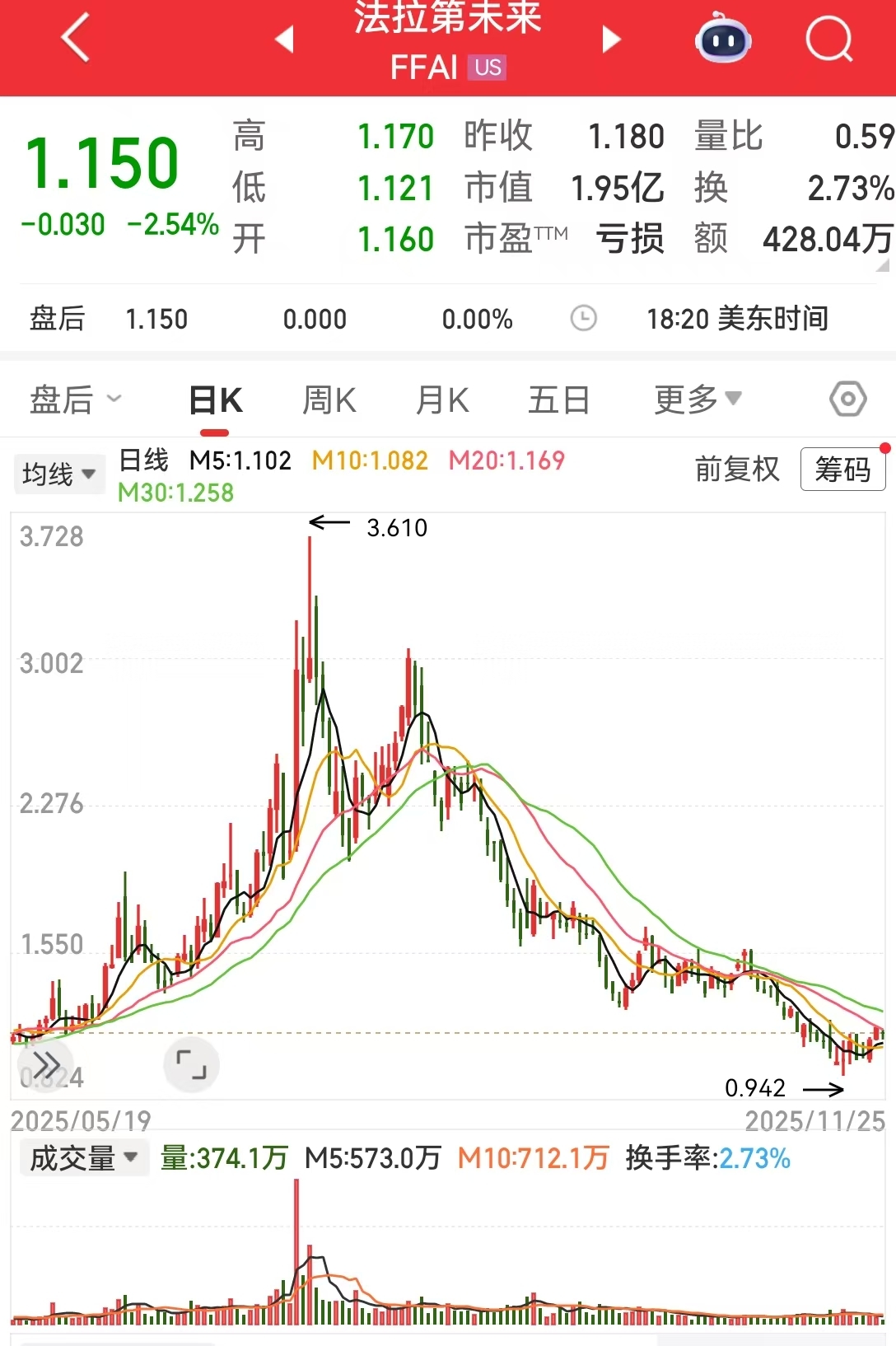 截至当地时间11月25日收盘法拉第未来报1.15美元,跌幅2.54%,市值1.95亿美元。值得注意的是,今年以来,法拉第未来股价跌幅一度达70%。