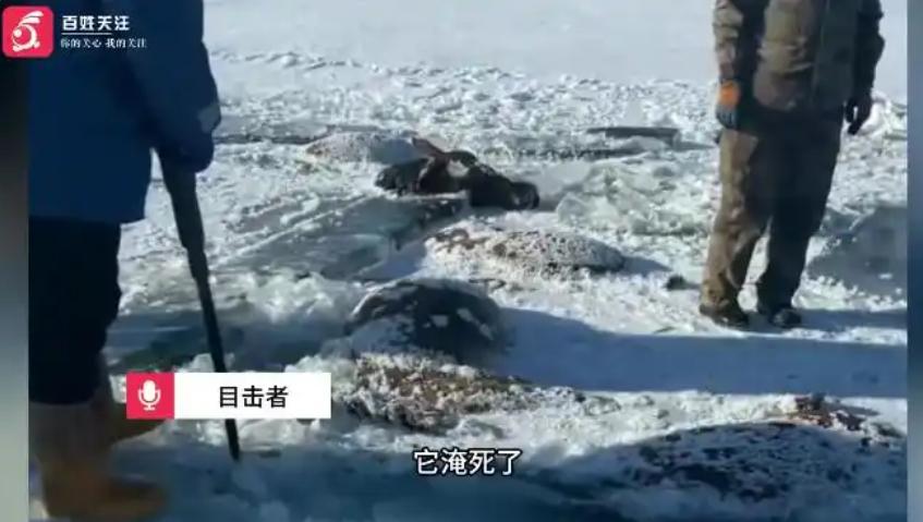 目击者称,马匹扎堆喝水冰面碎裂落水,马主人两天后才发现,在现场组织人员破冰打捞。