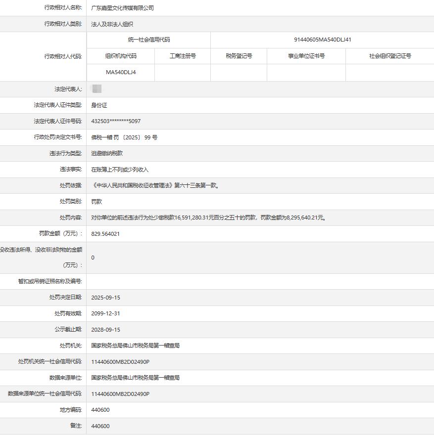 与此同时,潮新闻记者在中国国家税务总局广东省税务局的官网上,查到广东嘉星文化传媒有限公司的行政处罚信息。