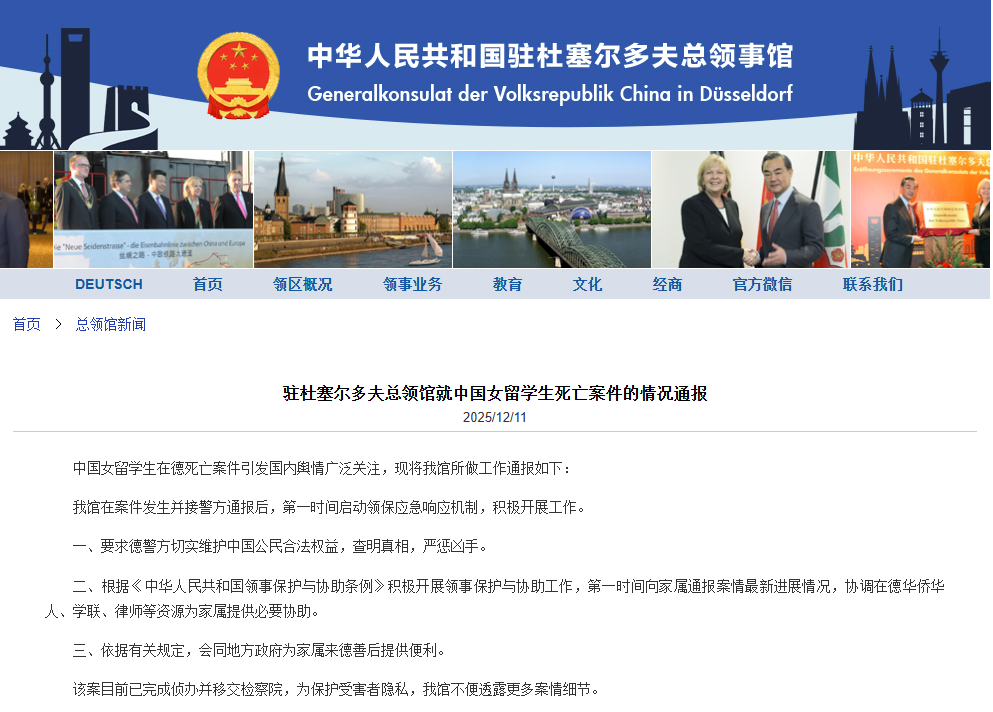 中国驻杜塞尔多夫总领馆12月11日就中国女留学生死亡案件发布情况通报,中国女留学生在德死亡案件引发国内舆情广泛关注,领馆在案件发生并接警方通报后,第一时间启动领保应急响应机制,积极开展工作。