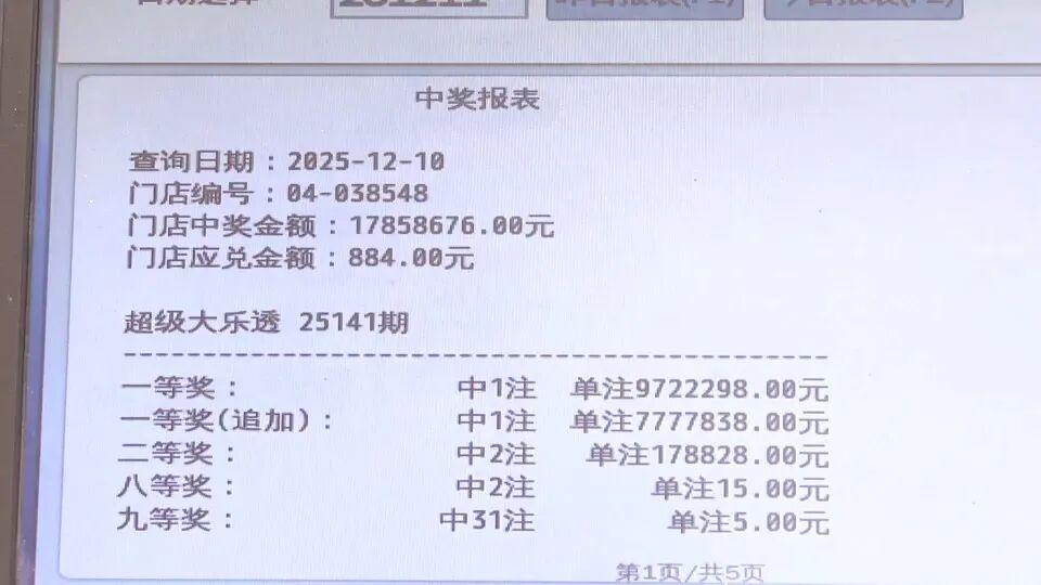 10号晚上,体彩大乐透25141期开奖,嘉善西塘的一张单式追加票,单票中奖金额高达¥1750万元。