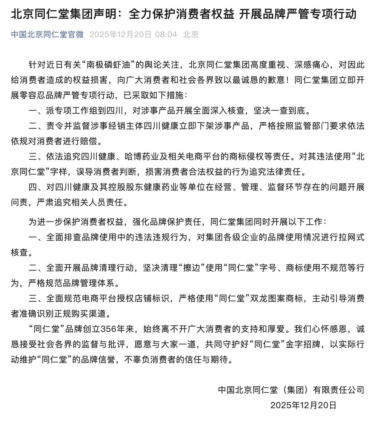 当地时间12月20日,同仁堂集团发布致歉声明称,针对近日有关“南极磷虾油”的舆论关注,集团对因此给消费者造成的权益损害,向广大消费者和社会各界致以最诚恳的歉意。