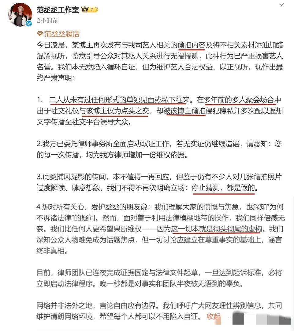 范丞丞工作室最先出手,凌晨3点就发布声明,直接否认私下往来,强调爆料是“偷拍误导”,还甩出五年前的聚会原图打脸,同时明确表示已经委托律师取证,马上就要起诉。鹿晗工作室更是硬核,两小时内连发两条声明,用区块链技术固定了数十条造谣证据,还晒出了AI合成鉴定报告,指出所谓的床照光影逻辑不通、发型违背重力,漏洞一眼就能看穿,直接放话“不接受和解,坚决走司法程序”。