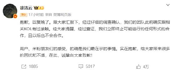 1月5日晚,小米集团董事长特别助理、战略市场部副总经理徐洁云发文称,经过仔细的调查确认,团队此前确实跟相关KOL有过接触。经大家提醒,经过查证,小米立即终止可能进行的任何形式的合作,且以后也不会合作。