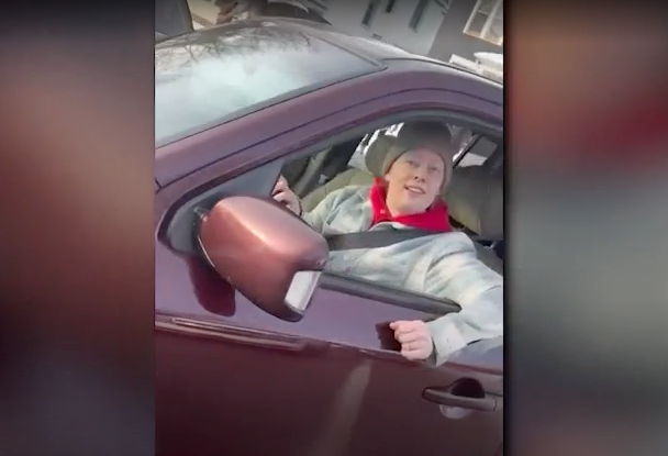 罗斯走过去拍摄了该SUV的后车牌,然后又拍向那名女性。那位女性戴着棒球帽,穿着法兰绒衬衫、连帽衫、运动裤和靴子,手里举着手机对准罗斯。