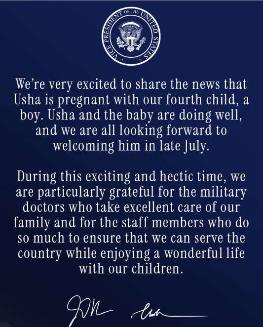 万斯夫妇还在声明中感谢了负责照顾其家庭的军医团队以及相关工作人员,对他们在孕期提供的专业支持表示感激。