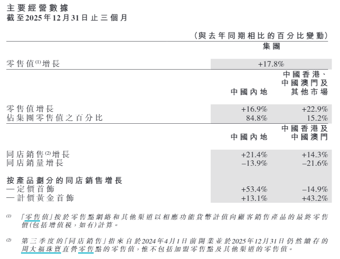 在截至2025年12月31日,零售值同比增长17.8%,远超上一季度4.1%的增速。其中,中国内地市场零售值增长16.9%,港澳及其他市场增长22.9%。