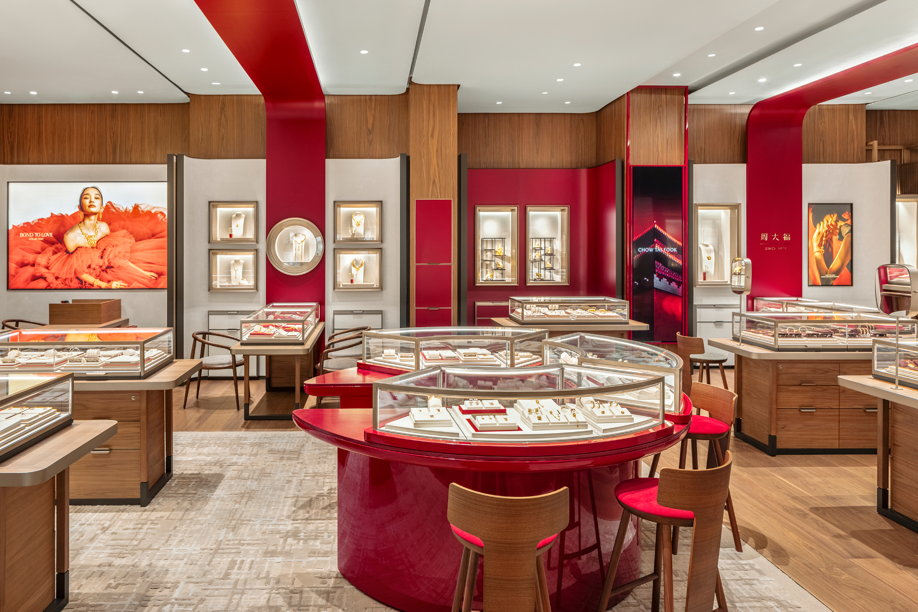暹罗百丽宫新店以品牌标志性的“周大福红”为主色调。为加强与当地文化的连结与情感共鸣,集团特别推出了具有泰国特色的独家臻品,致敬当地传统文化。