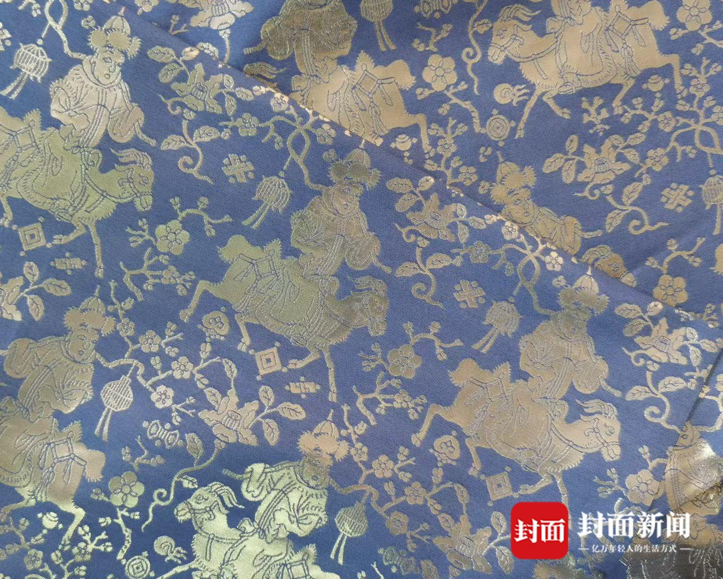 在衣料的选择上,陈诗宇所采用的是一款名为“绵羊太子阳生纹”的织金纹样。“阳生纹”是在冬至以后到春节期间另一款常用的吉庆花纹,蕴含着“冬至阳生春又来”的吉祥祝福。“这款纹样,用‘羊’来代表‘阳’,也蕴藏了三阳开泰的祝福。”