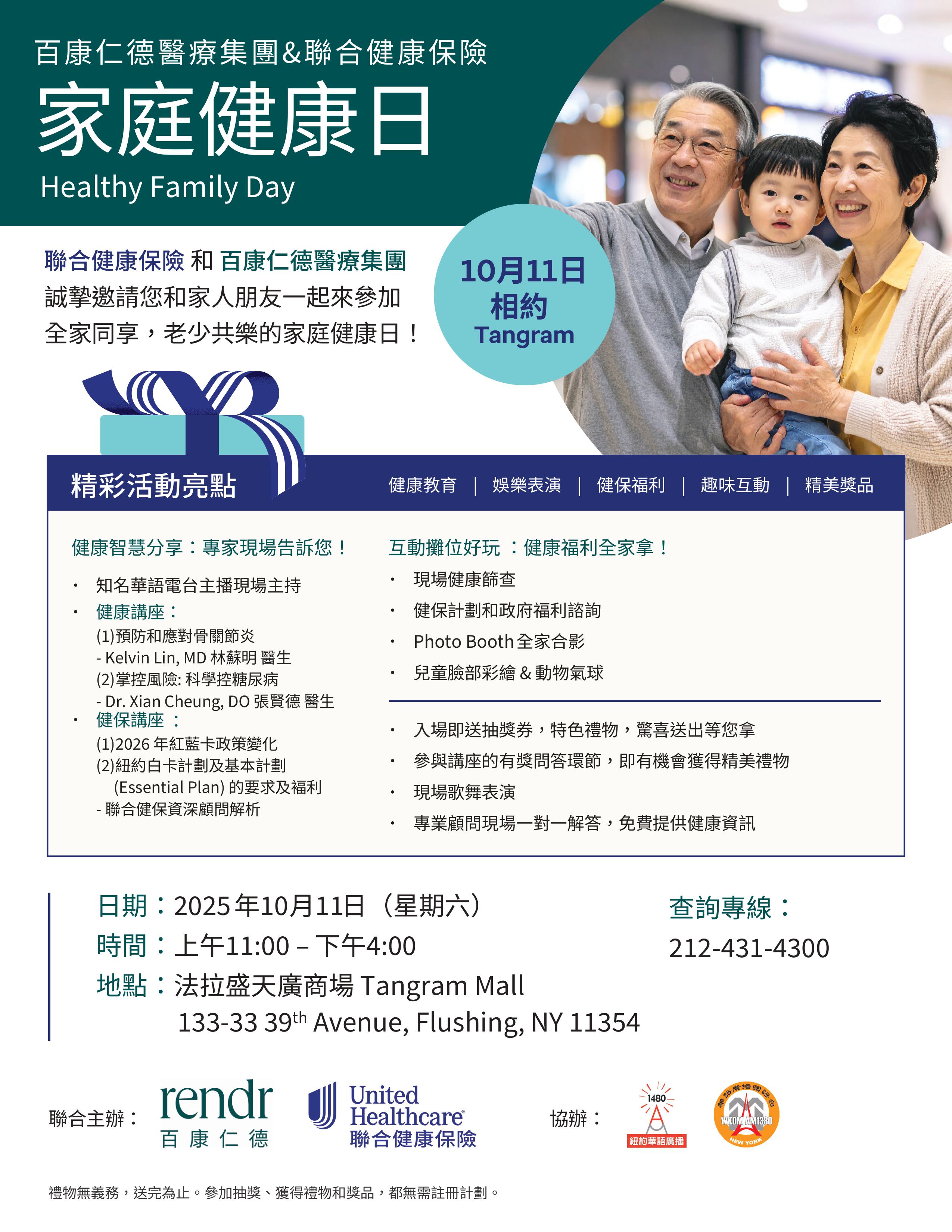 这个秋天,最值得全家出动的活动来了!百康仁德医疗集团(rendr)与联合健康保险(UnitedHealthcare)联手打造“家庭健康日”活动,邀您2025年10月11日(周六)在法拉盛天广商场Tangram Mall相见!以下精彩内容不容错过: