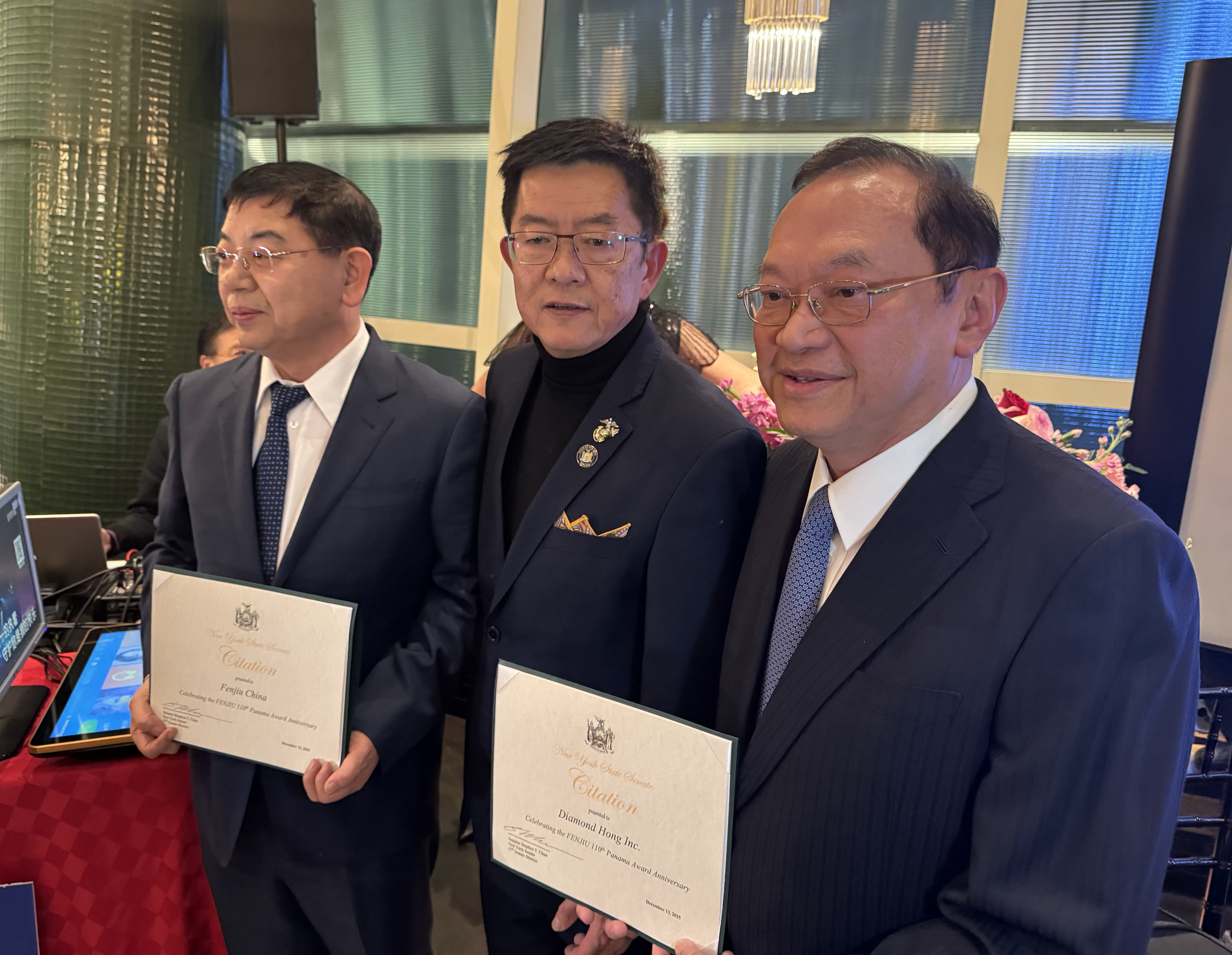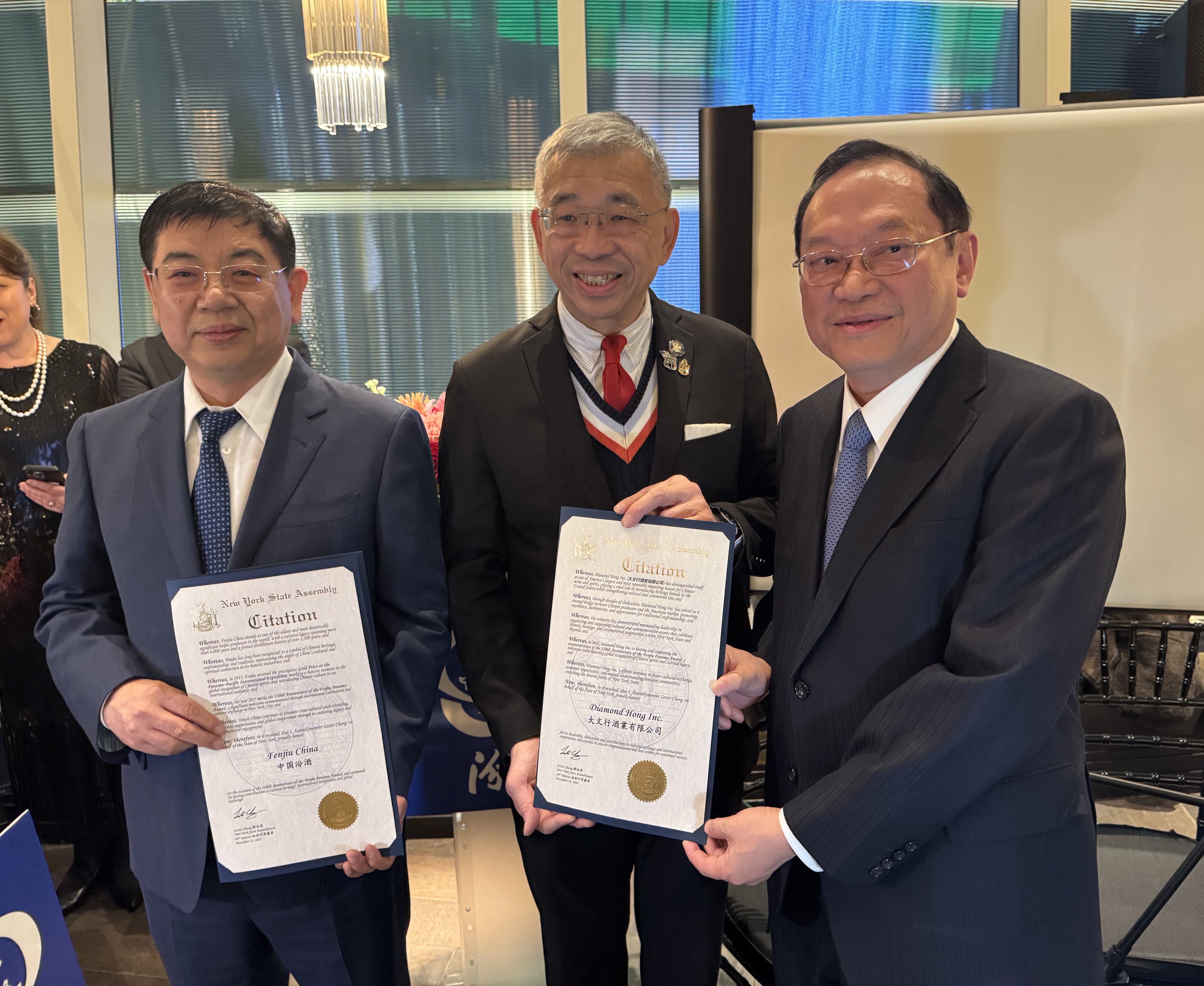 中国驻纽约总领馆领侨处副主任李德领事也应邀致辞。纽约市政府社区事务主管顾雅明代表市长亚当斯向汾酒访问团颁发了贺状。黄华清也代表市议员马泰向访问团颁奖。