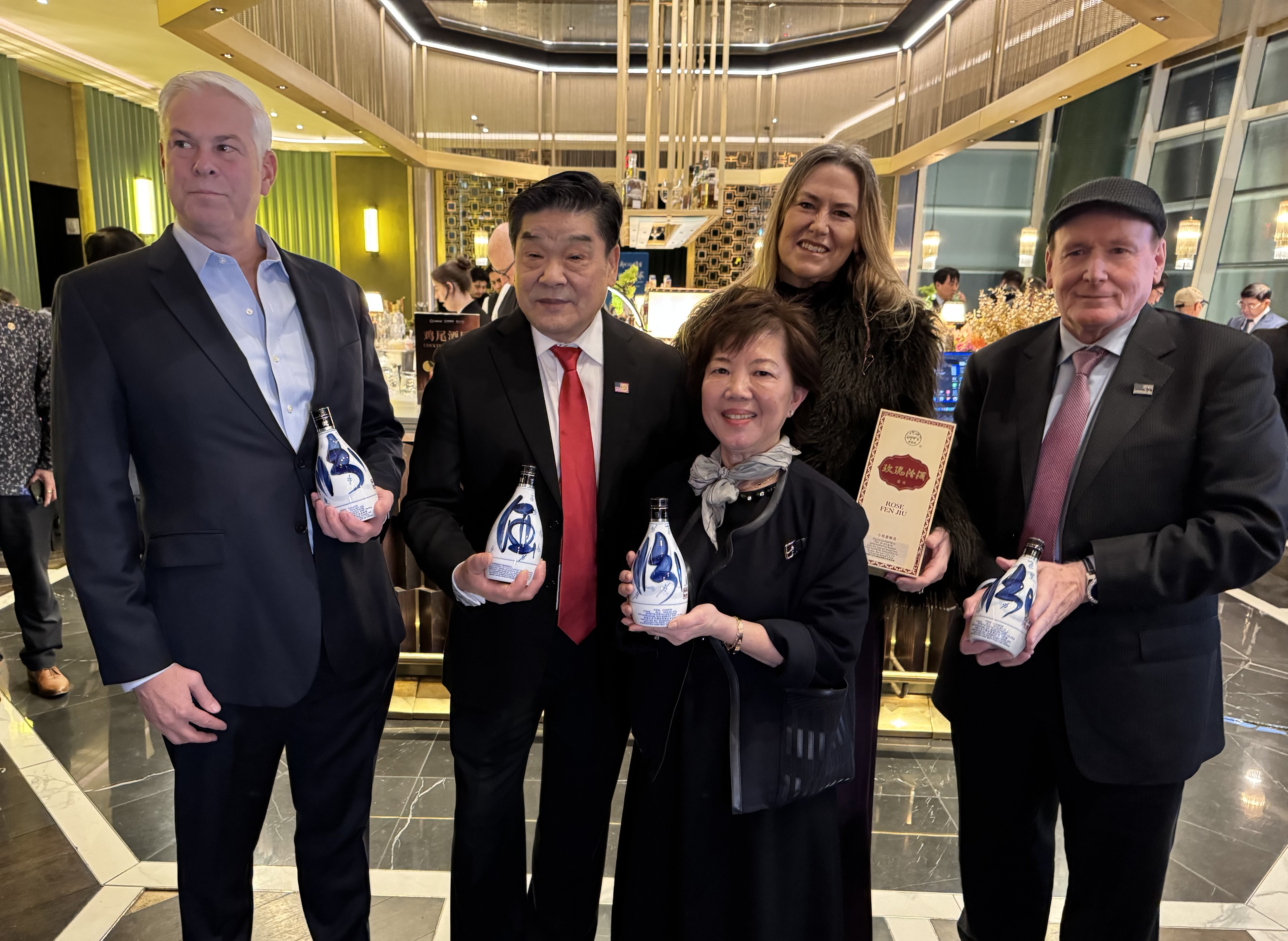 近日,来自山西汾阳的杏花村汾酒集团主管团队日前访问纽约,出席一系列中美酒文化交流活动,庆祝汾酒获得1915年在旧金山举行的巴拿马万国博览会(Panama–Pacific International Exposition)金奖110周年。全美总代理进口经销商-大文行酒业集团有限公司在位于曼哈顿的“胡同中餐厅”举行欢迎晚宴,近百位社区名流、商界翘楚到现场热烈欢迎来自山西汾酒集团董事长袁清茂、副总经理张勇踊、董事长、总经理相里宝宝等一行。
