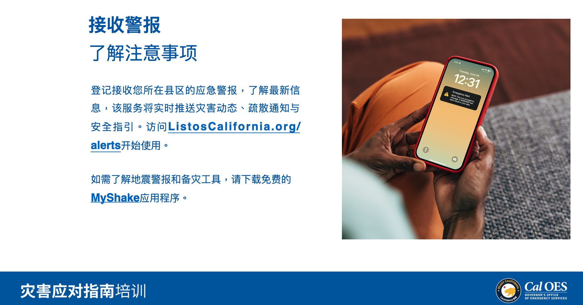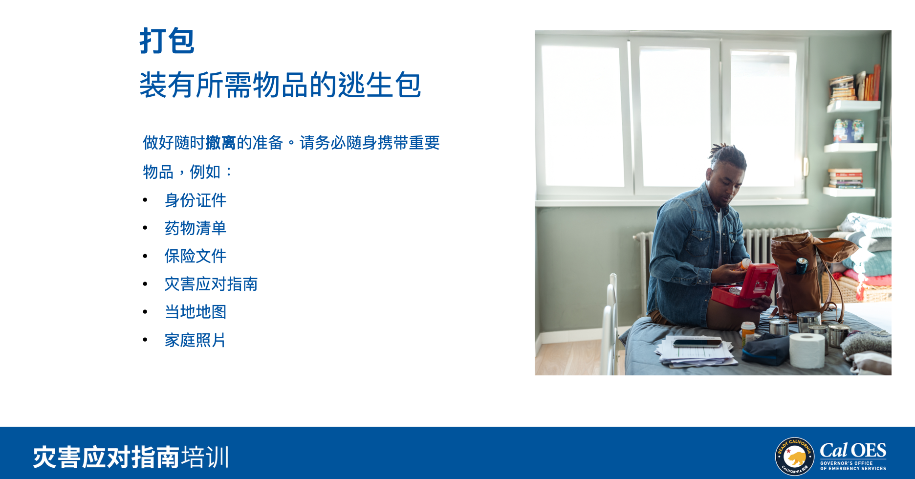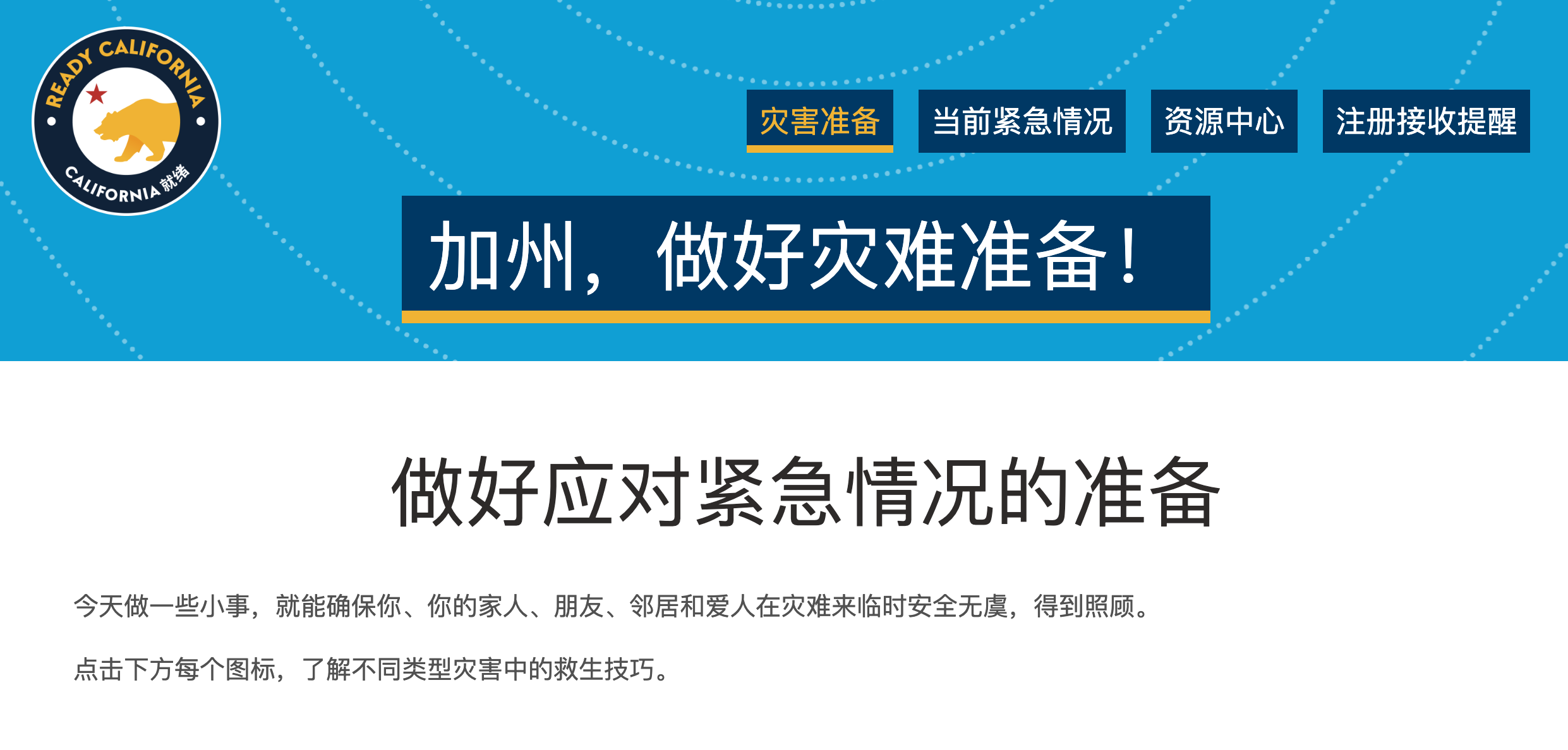 根据 Listos California 的防灾指南,居民可以通过五个简单步骤做好灾害准备, 第一步: 接收警报, 居民可以在 CalAlerts.org 注册,接收紧急警报。第二步:制定家庭计划, 提前与家人讨论紧急联系方法、疏散路线和集合地点。第三步:准备应急包, 应急包通常包括水、食物、药品、手电筒、手机充电设备和现金。第四步:准备家庭储备, 建议储备至少三天的生活物资。第五步:帮助邻居, 在灾害发生时,社区互助可以挽救生命。除了 Listos California,加州政府还通过 Ready.CA.gov 网站, 向公众提供灾害准备信息。该平台整合了多个政府机构的资源,包括:山火安全指南; 地震准备措施; 洪水应对方法; 高温天气防护建议等。Ready CA 旨在为居民提供一个统一的信息入口,使公众能够更方便地了解如何在灾害发生之前做好准备。