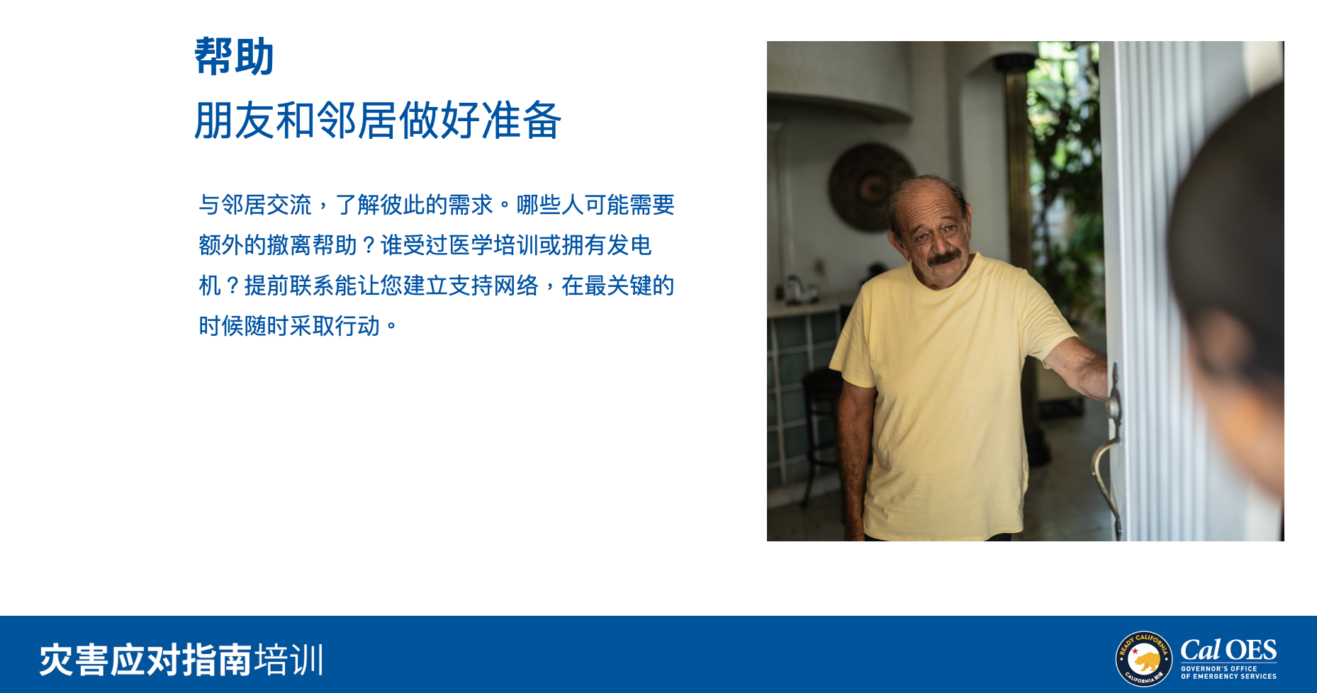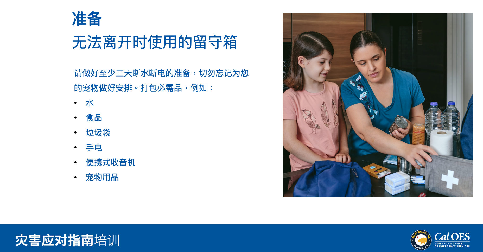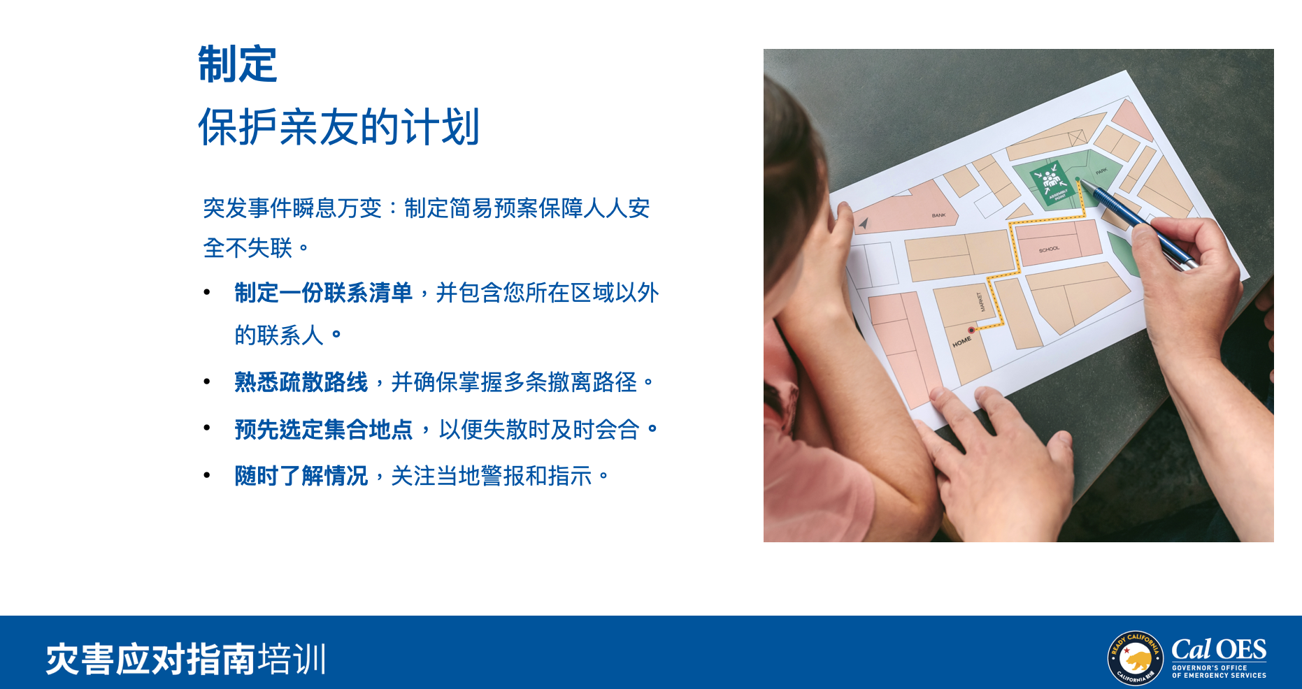 根据 Listos California 的防灾指南,居民可以通过五个简单步骤做好灾害准备, 第一步: 接收警报, 居民可以在 CalAlerts.org 注册,接收紧急警报。第二步:制定家庭计划, 提前与家人讨论紧急联系方法、疏散路线和集合地点。第三步:准备应急包, 应急包通常包括水、食物、药品、手电筒、手机充电设备和现金。第四步:准备家庭储备, 建议储备至少三天的生活物资。第五步:帮助邻居, 在灾害发生时,社区互助可以挽救生命。除了 Listos California,加州政府还通过 Ready.CA.gov 网站, 向公众提供灾害准备信息。该平台整合了多个政府机构的资源,包括:山火安全指南; 地震准备措施; 洪水应对方法; 高温天气防护建议等。Ready CA 旨在为居民提供一个统一的信息入口,使公众能够更方便地了解如何在灾害发生之前做好准备。