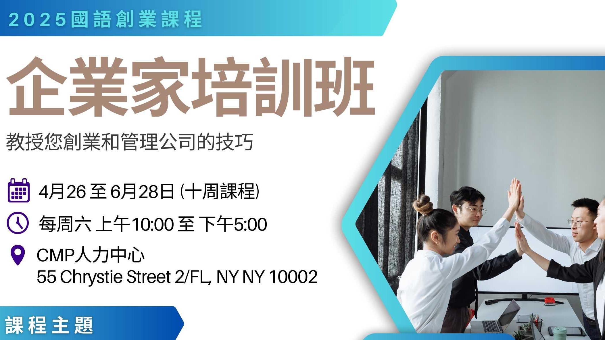 在创业的道路上,许多人常常感到无从下手,并且缺乏有效的指导和支持。在这种情况下,找到一个可靠的团队和经验丰富的导师变得尤为重要。然而,许多有志创业者面临的挑战在于缺乏适当的资源和专业的指导。为了解决这些问题,CMP人力中心特别推出了一项企业家培训班,旨在为有志于创业的个人提供全面的支持和辅导。 本次培训班由纽约州经济发展局(Empire State Development)赞助,CMP人力中心属下的商业辅助中心承办,由来自不同领域的专业人士主讲。课程将带领学员深入探讨创业相关的每一个话题,包括公司注册、商业法律、税务、保险、市场研究与推广、贷款、小型企业资源与最新的经商信息。 企业家培训班将于4月26日至6月28日期间举行,每周六上午10点至下午5点,上课时间共计10周。课程全程以国语授课。上课地点位于CMP人力中心办公室:55 Chrystie Street 2/FL, New York, NY 10002。参加此次课程的学员将有机会通过实际操作和专家指导,提升商业技能,为未来成功奠定坚实基础。报名现已开放,欢迎有志于创业的朋友前来参加。报名请致电 (646) 603-7172 或电邮联系 janicezhu@cmpny.org