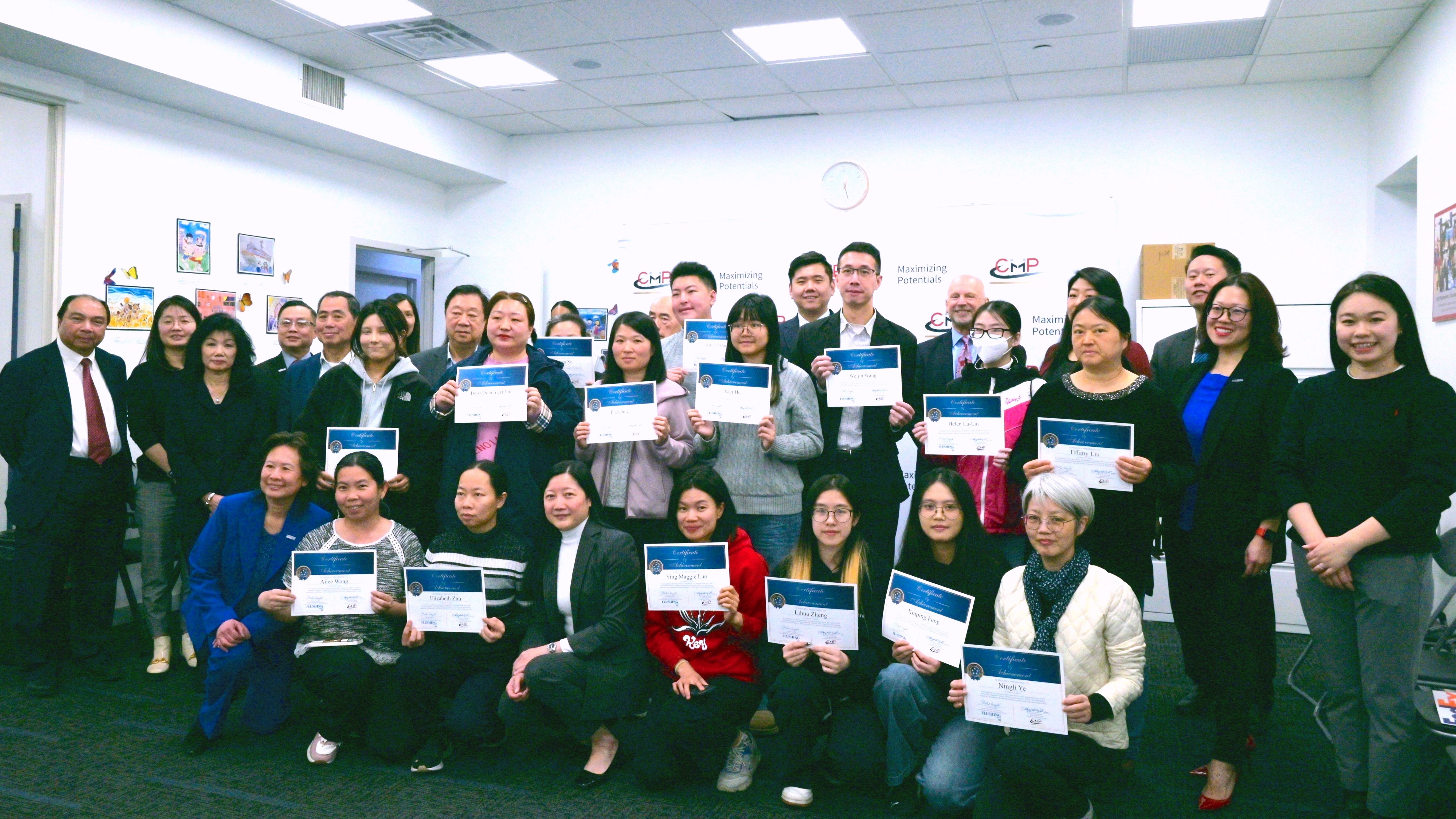 人力中心与法拉盛银行(Flushing Bank)联合举办的理财知识与零售银行免费职业培训班于2025年3月21日(星期五)圆满结课,并于当日中午在人力中心举行毕业典礼。活动现场向成功完成为期八周的密集培训的18位学员颁发结业证书,以表彰他们的努力与成就。 此次毕业典礼是人力中心自2020年火灾及疫情后第二个成功完成的职业培训项目,同时也是首次对外公开的毕业典礼,吸引了社区的广泛关注。活动当天,多位法拉盛银行高层代表出席。资深行政副总裁兼首席零售与客户开发官Mike Bingold在致辞中强调了他们对社区发展的长期承诺,并表示此次培训班是法拉盛银行回馈社区的重要举措。资深副总裁兼零售银行业务总监Ling Xu分享了她作为移民家庭出身的个人经历,并表示法拉盛银行将持续支持新移民的职业发展。“我们希望通过这样的培训,不仅帮助学员实现个人成长,更期待他们未来能回馈社区,形成良性循环,”她强调。 出席嘉宾还包括法拉盛银行资深副总裁兼亚洲区总监Judy Ng、资深副总裁兼皇后区区域经理John Siu、副行长兼华埠分行行长Li Fang Chen、副总裁兼凯辛娜(Kissena)分行经理Leo Wang、副总裁兼财务顾问Jessica Han,人力中心五位董事成员,以及三位州参议员卡凡纳(State Senator Kavanagh)、众议员李荣恩(Assemblymember Grace Lee)和市议员马泰(Councilmember Marte)的代表,共同见证这一重要时刻,影响深远。 培训毕业学员代表Summer和Johnathan在典礼上分享了他们的学习心得。他们表示,课程不仅让他们掌握了银行结构、投资理财等专业知识,更体会到友善、耐心等职业素养的重要性。“这是一段改变我人生的学习旅程,”Summer说道。 该免费培训班于2025年1月开课,旨在通过八周的金融教育与实务培训,帮助不同经验水平的学员掌握银行业的核心技能。本期学员中既有在校生,也有正在寻找兼职或全职工作的求职者。课程由法拉盛银行专业代表以普通话及英语授课,同时,人力中心还提供简历撰写、求职信指导及面试准备等辅助服务,助力学员顺利进入职场。法拉盛银行今年将在纽约华埠且林士果广场(Chatham Square)新设分行,届时将优先考虑招聘本期培训班的优秀毕业生,为学员提供实际就业机会。 作为一家非营利职业与小型企业发展机构,人力中心下设经纽约州教育部许可的私立职业学校,并以QuickBooks会计培训、认证护理助理(CNA)及厨师培训等多样化职业课程闻名社区。2020年,一场五级大火摧毁了其原有教学场地,但人力中心并未因此止步。去年,人力中心首次重启职业培训服务,推出与伟生冷暖气公司(S&W Wilson, Inc.)合作的暖通空调培训课程,获得社区热烈好评。本次银行培训班,以及与亚美医协慈善基金会(CAIPA Foundation)合作的医疗前台接待员培训班,是2025年新增设的职业培训项目。人力中心将持续致力于为社区提供优质培训服务,助力实现经济自给自足和职业发展,为纽约社区注入更多活力与希望。 关于人力中心:CMP成立于1972年,是一家非营利的职业与小型企业发展组织。我们的使命是促进经济自给自足和职业发展,为不同背景的社区提供服务,并在支持亚洲移民人口方面享有良好口碑。了解更多:www.cmpny.org