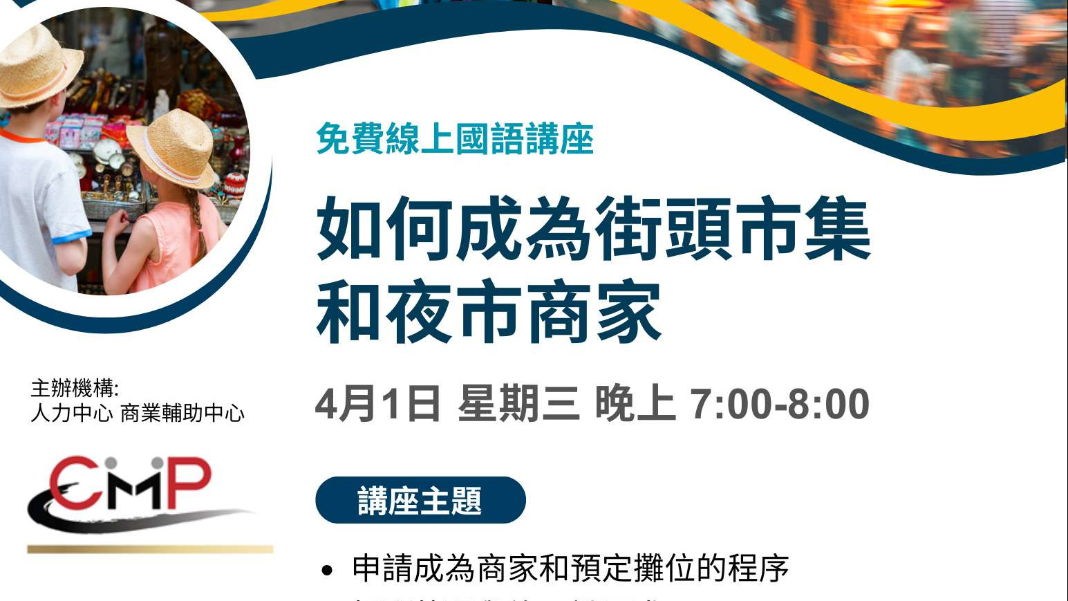 CMP人力中心属下的商业辅助中心将举办一场主题为《如何成为街头市集与夜市商家》的线上讲座。本次讲座专为有意在街头市集或夜市创业的朋友精心设计,旨在提供全面的指导与实用信息,协助参与者了解开展摆摊业务的基本流程、相关法规要求,以及成功经营摊位的关键要素。无论您是刚开始探索摆摊创业机会的新手,还是希望进一步提升现有摊位业务的经营者,本次讲座都将为您带来宝贵的信息与实用技巧。 在讲座中,我们将重点介绍:• 摆摊销售所需的各类执照与经营许可证,包括申请流程及相关法规要求;• 成为市集或夜市商家的完整步骤,从注册商家到预订摊位的流程与注意事项;• 摆摊经营的实用策略与最佳做法,包括如何设计吸引顾客的摊位布置、运用有效的营销方式,以及确保合规经营的重要建议。 本次讲座将于4月1日(星期三)晚上7时至8时以线上形式举行。活动免费参加,并以国语讲解。我们诚挚邀请所有对街头市集与夜市创业感兴趣的朋友踊跃报名,一同了解如何顺利开展并成功经营您的摆摊生意! 报名请访问以下链接:https://bit.ly/streetfairs0401 或致电人力中心 (646) 603-7172 查询详情。 关于人力中心:自1972年成立起,人力中心一直致力于为纽约移民及低收入群体提供就业咨询、职业技能训练及小商业创业发展等服务,以协助社区民众实现经济上的自给自足。