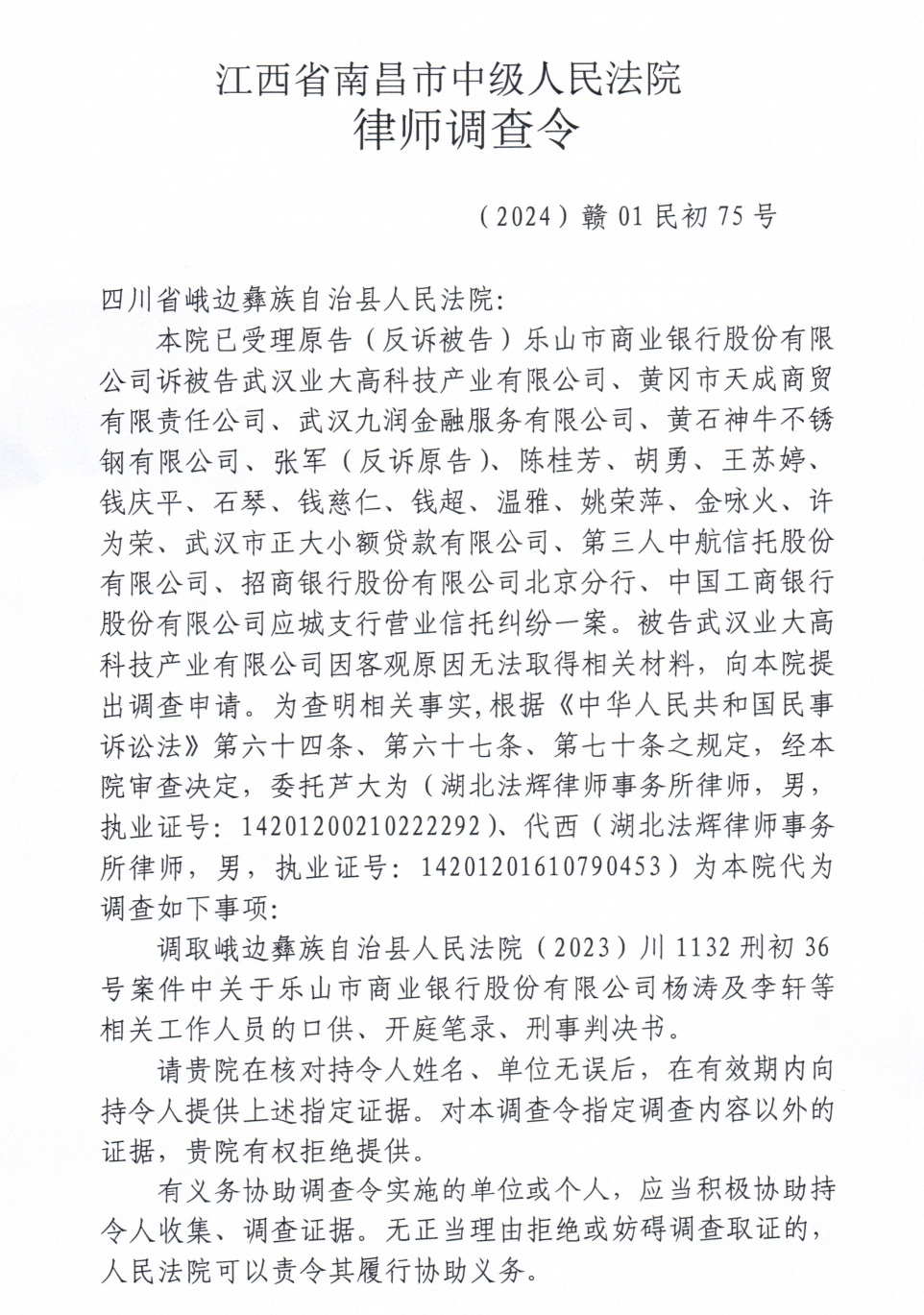 南昌中院调取有关乐山市商业银行刑案资料的调查令(部分)