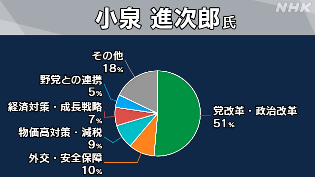 小泉最常提及的主题是“政党改革和政治改革”,占据了他演讲近一半的篇幅。他呼吁“解散重新开始”以重振自民党,强调团结的必要性。