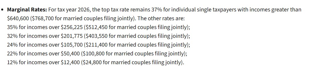 个人豁免额 (Personal Exemptions):“美丽大法案”将2017年税改中取消个人豁免额的政策永久化。因此,2026年的个人豁免额仍为 0。