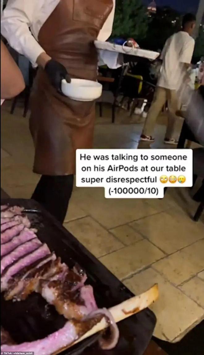 有客人抱怨他花了500英镑请Salt Bae切牛排,但大忙人Salt Bae,一边切牛一边戴着耳机跟别人打电话呢。