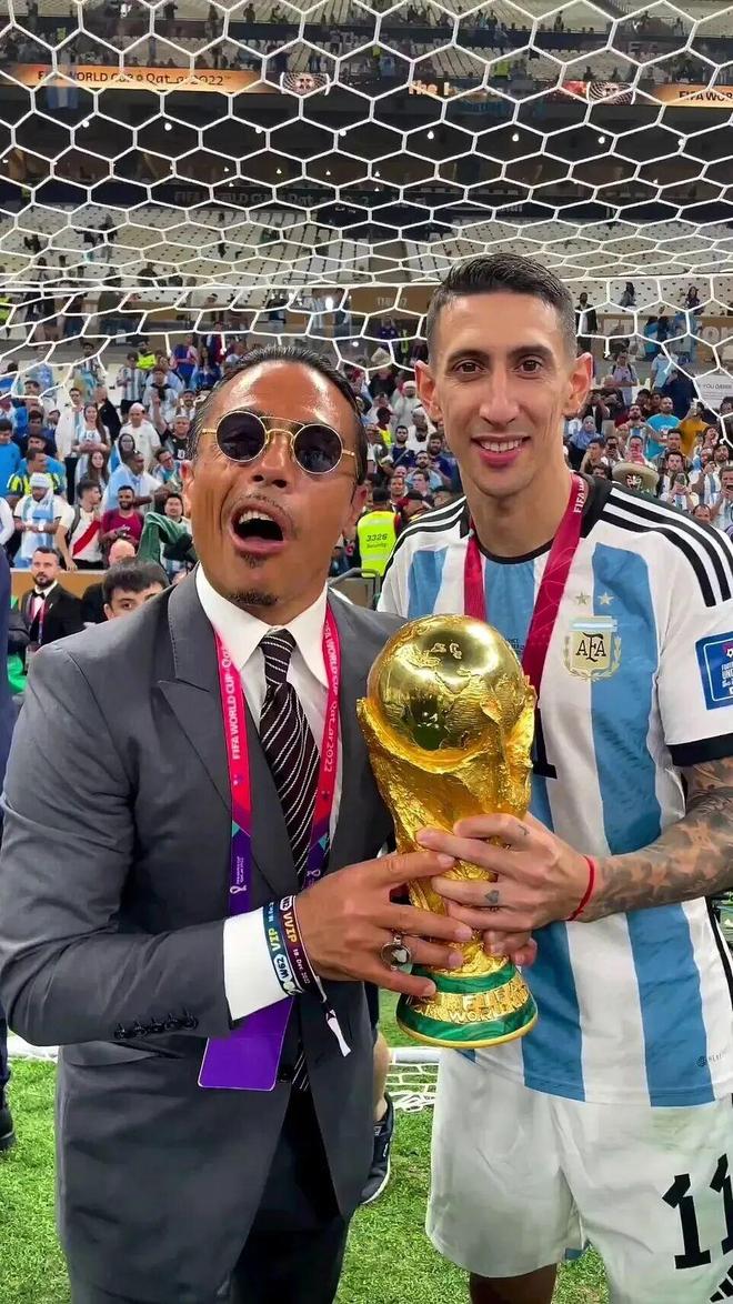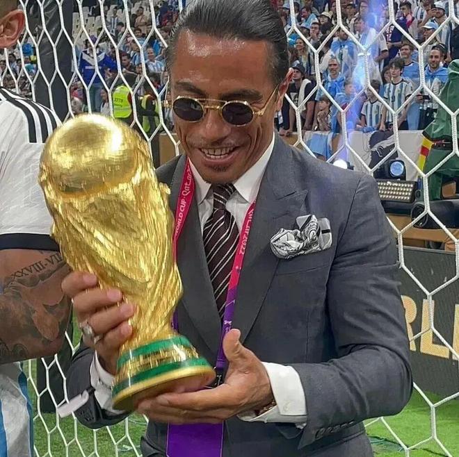 2022年世界杯决赛,阿根廷夺冠时刻,SaltBae突然闯入球场,强行搂抱梅西、亲吻奖杯,甚至干扰庆祝活动。