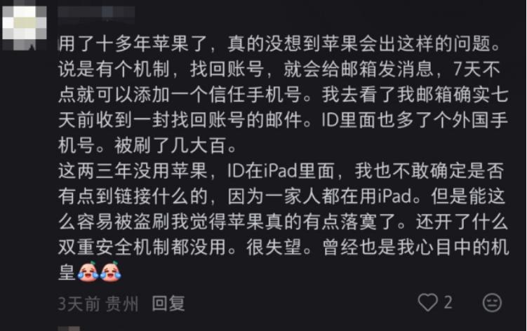 声称苹果ID被盗刷的用户发帖 图片来源:网络平台截图