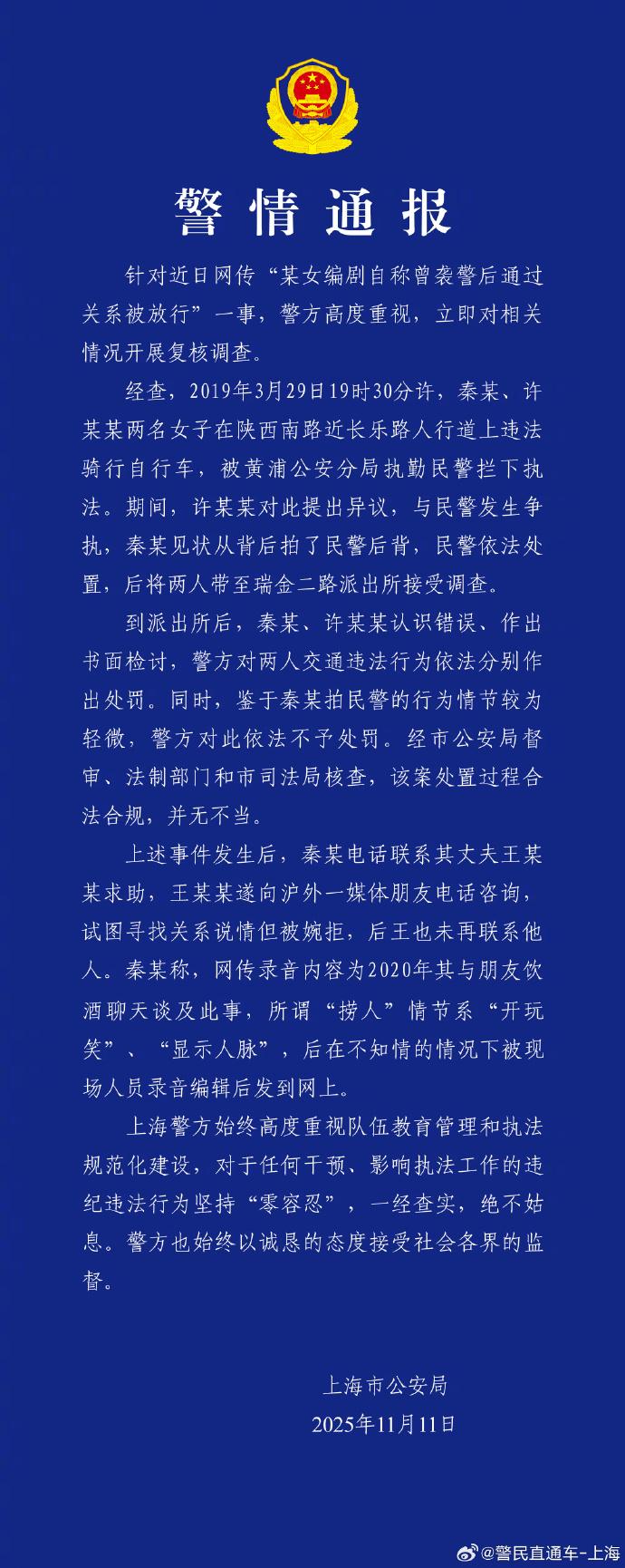 11月11日,上海市公安局发布警情通报:针对近日网传“某女编剧自称曾袭警后通过关系被放行”一事,警方高度重视,立即对相关情况开展复核调查。