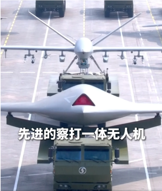 值得一提的是,片中给出多个特写画面的攻击-11,最早于2019年国庆大阅兵首次公开展示。而在今年的九三阅兵中,一款类似攻击-11的新型无人攻击机已然全新亮相。