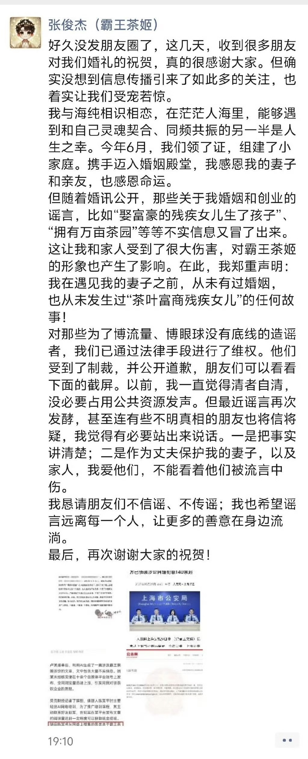 张俊杰朋友圈发文辟谣