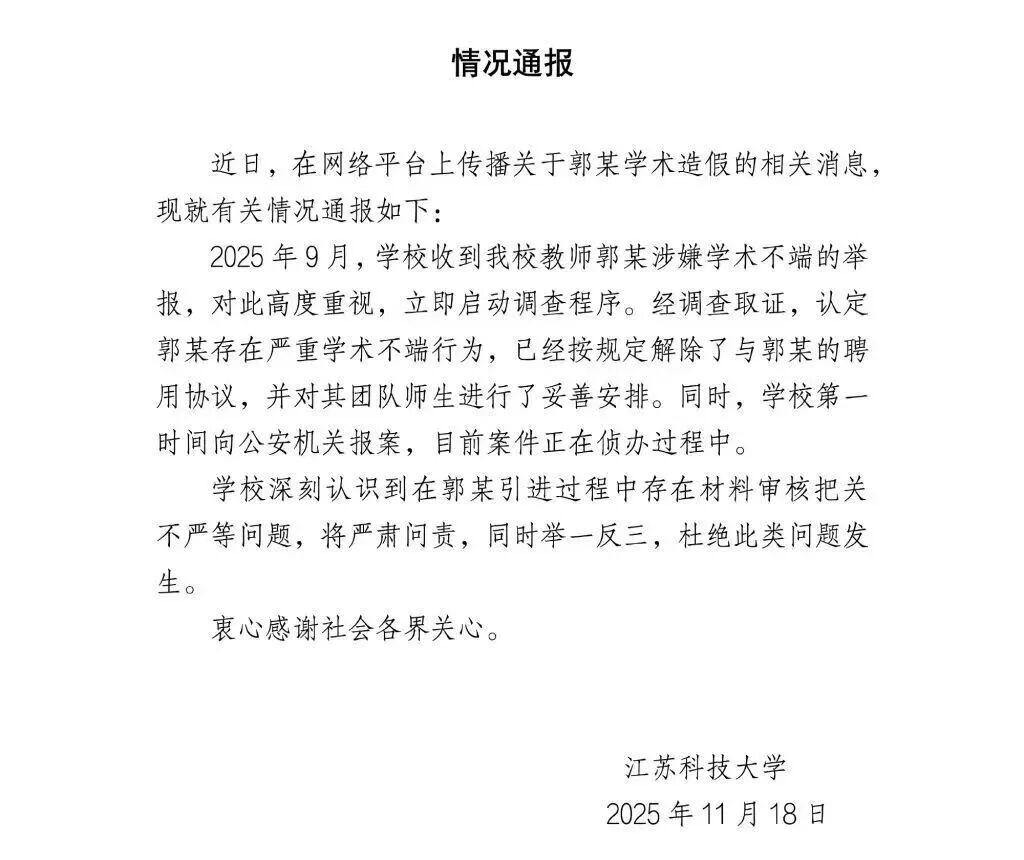 11月18日,江苏科技大学官方微博发布情况通报。通报称,今年9月,学校收到我校教师郭某涉嫌学术不端的举报,对此高度重视,立即启动调查程序。经调查取证,认定郭某存在严重学术不端行为,已按规定解除了与郭某的聘用协议,并对其团队师生进行了妥善安排。同时,学校第一时间向公安机关报案,目前案件正在侦办过程中。学校深刻认识到在郭某引进过程中存在材料审核把关不严等问题,将严肃问责,同时举一反三,杜绝此类问题发生。