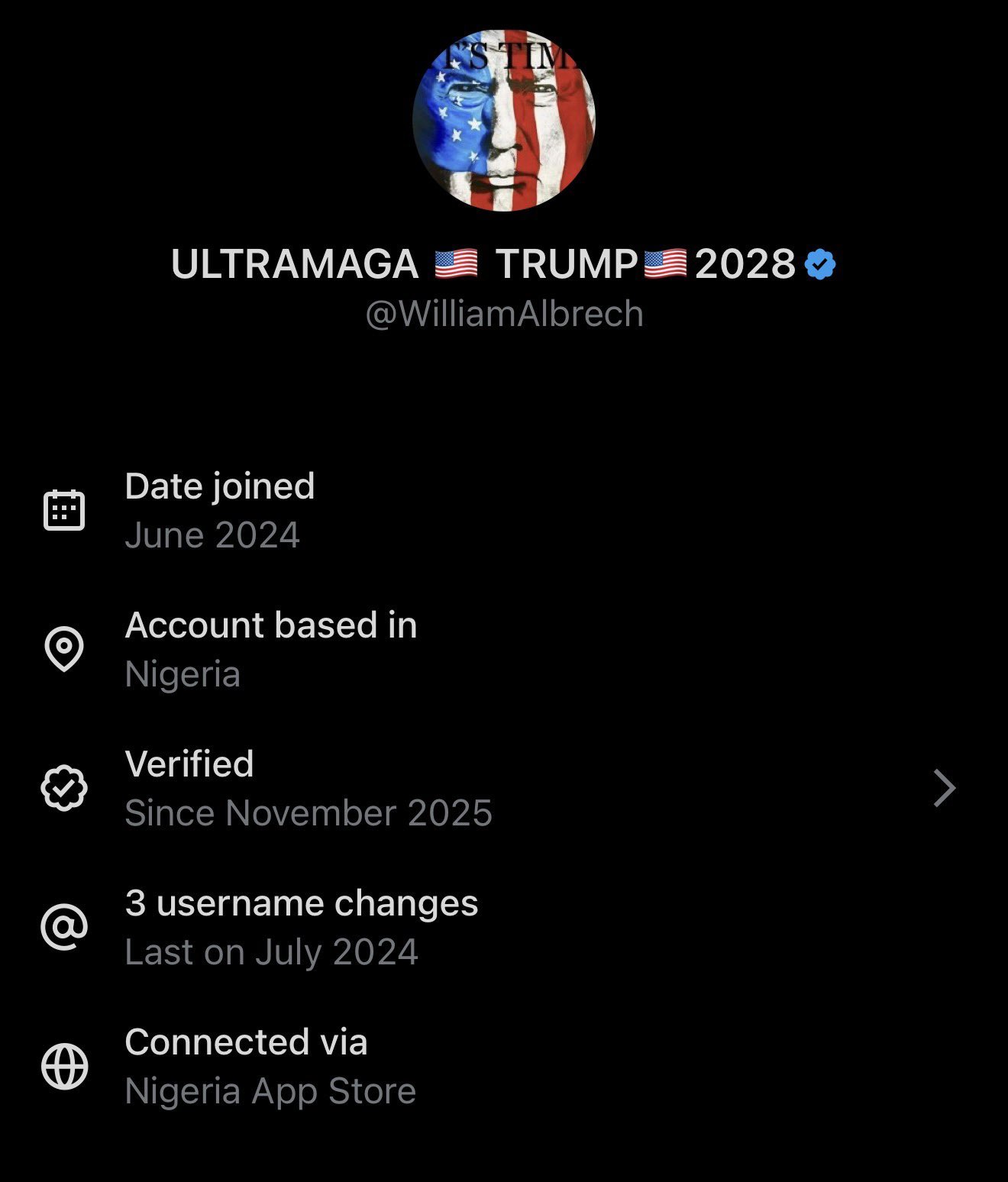 例如,一个名为“ULTRAMAGA TRUMP 2028”的账号声称位于华盛顿特区,但位置标签却显示在尼日尼亚。另一个现已删除的“Trump Is My President”账号,其注册地显示为马其顿;一个用户名为 @American、使用秃鹰与美国国旗作为头像的账号,则被标示为位于南亚。
