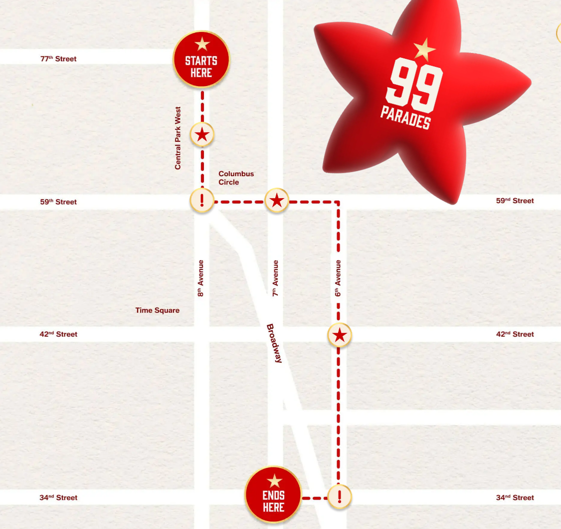梅西百货大游行线路图,星标为建议最佳观赏区,感叹号为封闭区。梅西官网