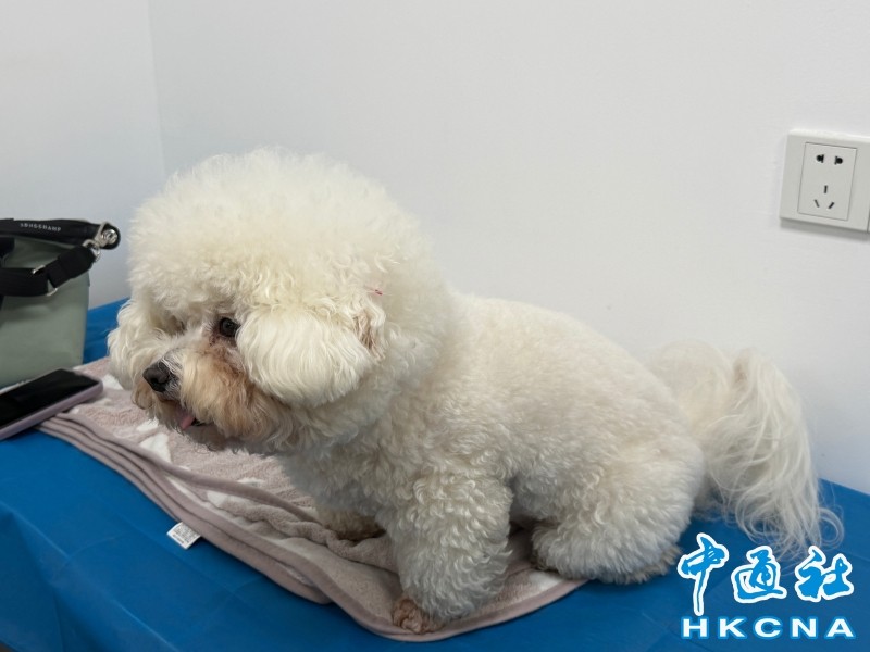 12月11日,一只比熊犬正接受针灸治疗,其耳侧粉红色条装物为针灸。香港中通社图片