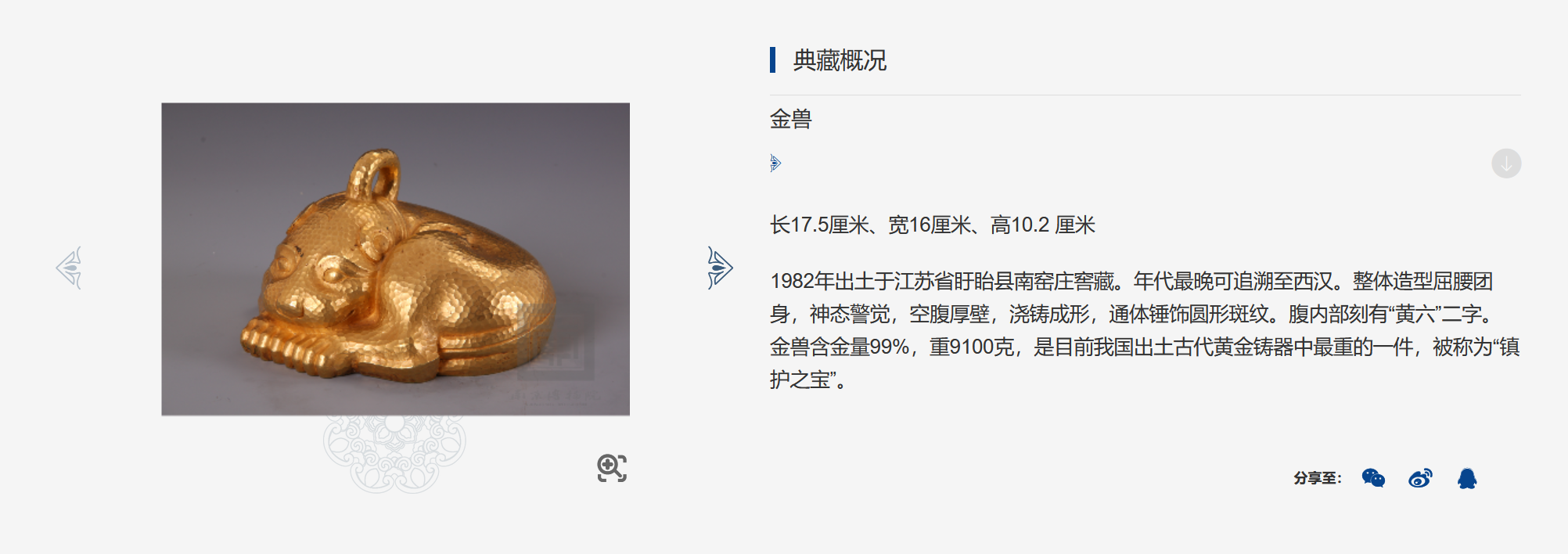 南京博物院官网简介显示,金兽长17.5厘米、宽16厘米、高10.2厘米。1982年出土于江苏省盱眙县南窑庄窖藏。年代最晚可追溯至西汉。整体造型屈腰团身,神态警觉,空腹厚壁,浇铸成形,通体锤饰圆形斑纹。腹内部刻有“黄六”二字。金兽含金量99%,重9100克,是目前中国出土古代黄金铸器中最重的一件,被称为“镇护之宝”。