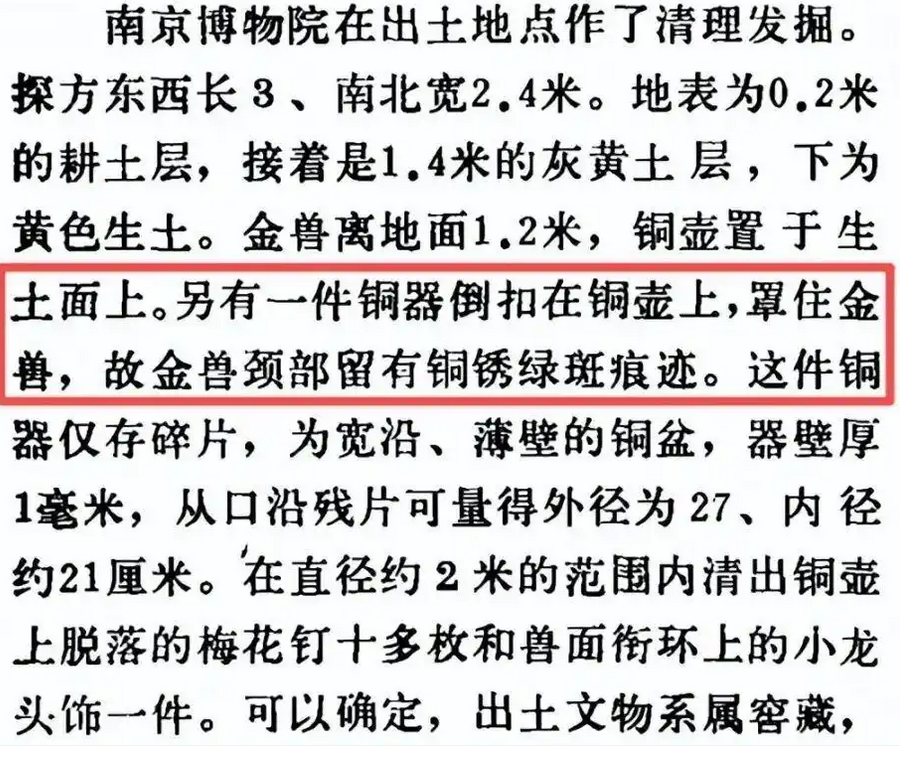 另据华商报大风新闻援引的《文物》期刊资料,南京博物院原院长姚迁在《江苏盱眙南窑庄楚汉文物窖藏》一文中提及,出土时,金兽离地面1.2米,铜壶置于生土面上。另有一件铜器倒扣在铜壶上,罩住金兽,故金兽颈部留有铜锈绿斑痕迹。