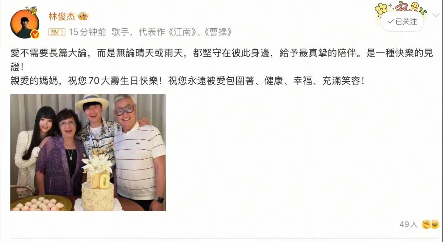 这一天恰逢林俊杰的妈妈70岁生日,照片中,林俊杰和女友甜蜜相伴,温馨的氛围令人动容。他还祝福母亲“永远被爱包围着,健康、幸福,充满笑容!”