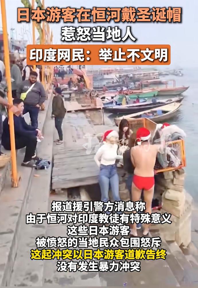 报道援引警方消息称,这起冲突发生于12月25日,当时多名日本游客头戴圣诞帽在当地一处码头前玩耍打闹,其中一名男子还脱掉外衣准备下河游泳。由于恒河对印度教徒有特殊意义,这些日本游客被愤怒的当地民众包围怒斥。警方称,这起冲突以日本游客道歉告终,没有发生暴力冲突。