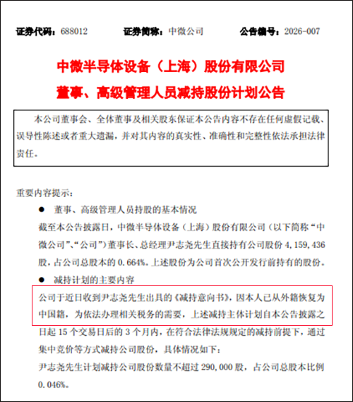 公告显示,被誉为“中国刻蚀机之父”的尹志尧减持股份的原因是:“因本人已从外籍恢复为中国籍,为依法办理相关税务的需要。”