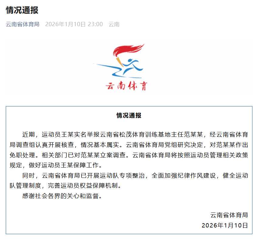 据云南省体育局微信公众号消息,1月10日晚,云南省体育局发布情况通报: